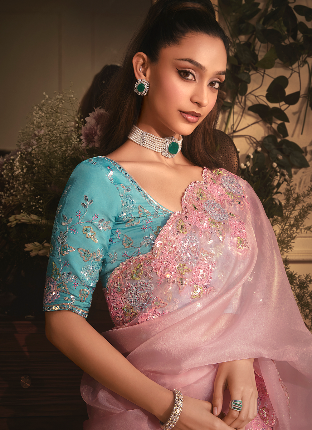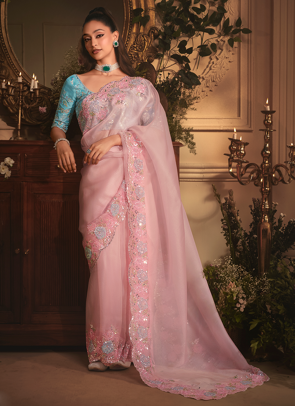 Elevate your bridesmaid look with this stunning Baby Pink Sequins Embroidered Organza Tissue Silk Saree. Woven from luxurious organza tissue silk, this piece showcases intricate embroidery work that flatters every frame with sophistication. The ornate border, scattered buttis, and embellished pallu feature shimmering zari, resham threads, and sequins that catch light beautifully. Paired with a matching sequined satin silk blouse, this saree transforms you into a showstopper at weddings and celebrations. The perfect blend of traditional elegance and contemporary sparkle, it's designed for those who refuse to blend into the background. Style with statement jewelry and a polished braid to command attention.
