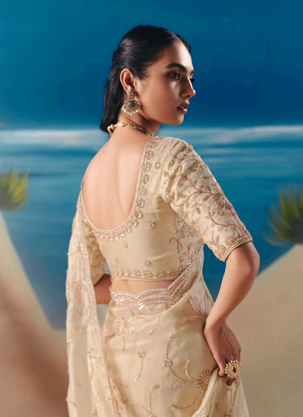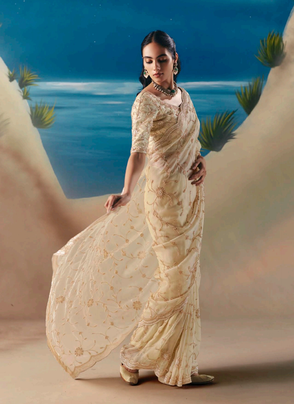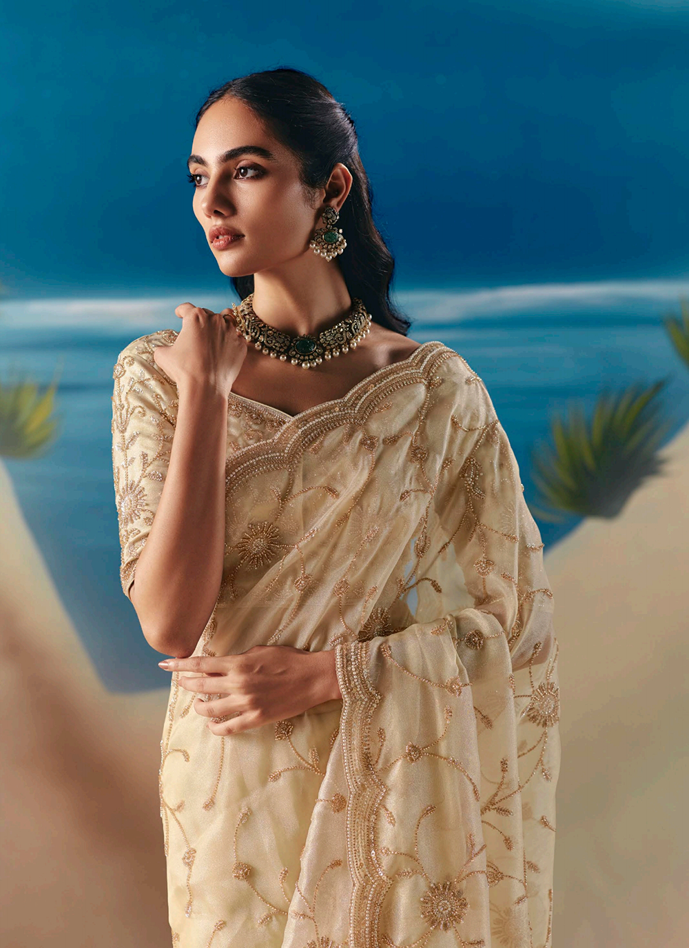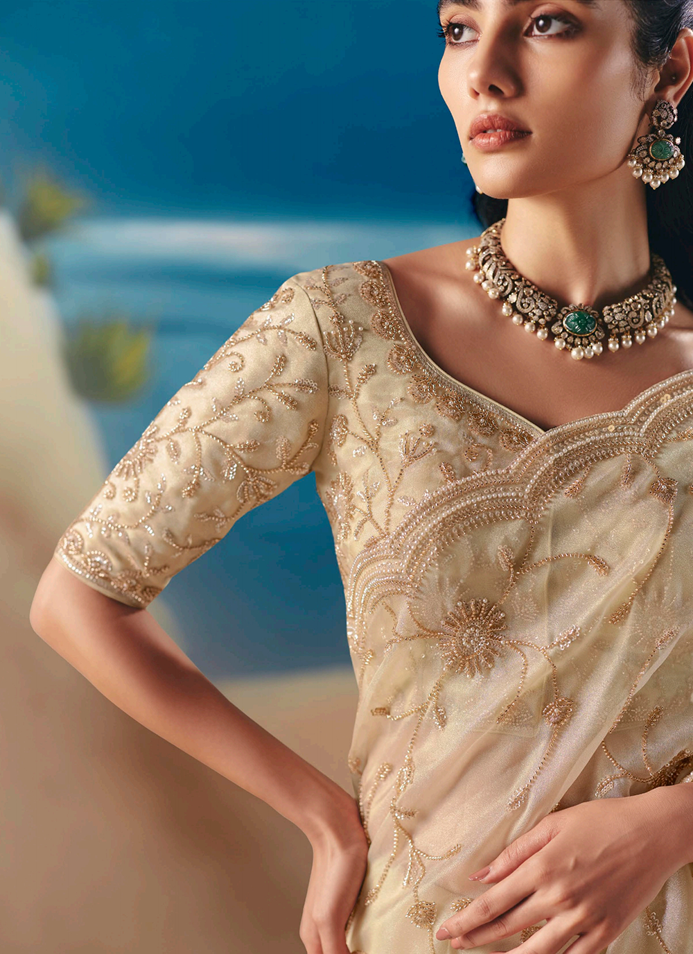 Discover timeless elegance with this exquisite cream saree, woven from premium fancy organza tissue silk that cascades with graceful sophistication. Hand-embroidered details showcase traditional artistry across the border, hem, and pallu, enriched with resham threads, lustrous golden zari, pearl beads, sequins, and cutdana moti work for an unmistakably luxurious finish. The coordinating silk blouse boasts intricate embellishments on the sleeves, neckline, and back, ensuring you radiate refinement from every perspective. Perfect for weddings, festive celebrations, and evening occasions, this saree masterfully bridges heritage craftsmanship with contemporary allure. Invest in a piece that commands attention and celebrates your impeccable taste—pair with classic jewelry and elegant heels for an unforgettable statement.