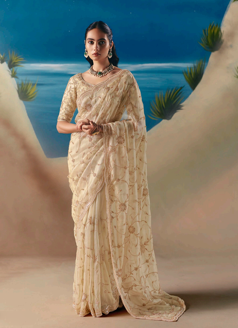 Designer Cream Fancy Organza Tissue Silk Handwork Party Wear Saree | 1 | Siya Fashion