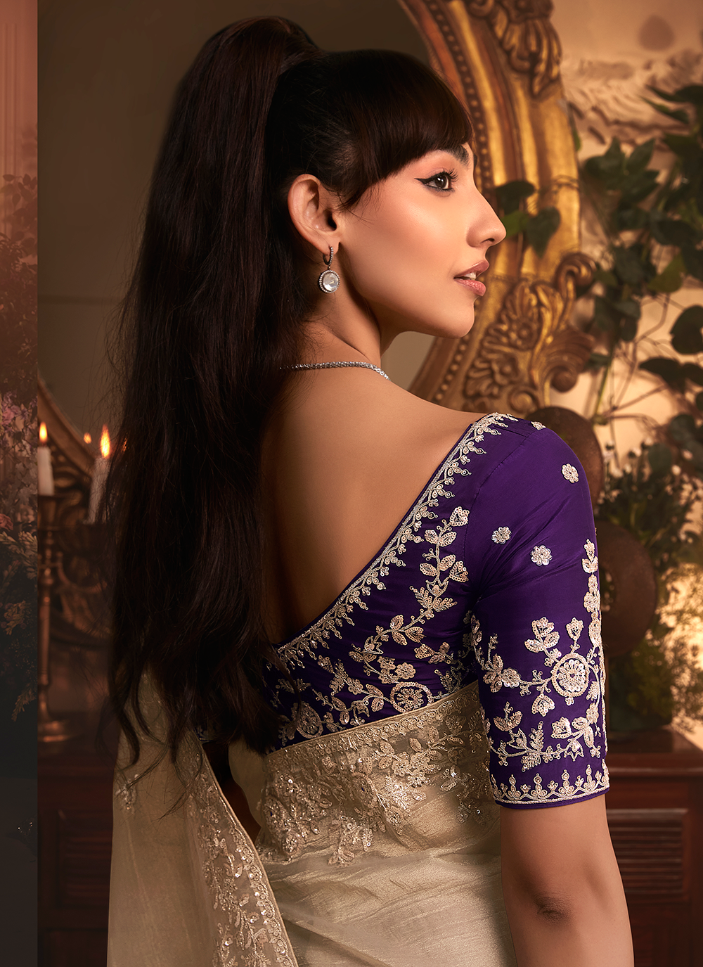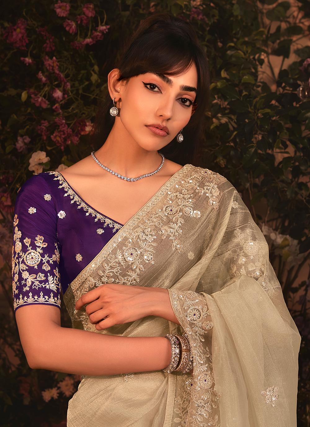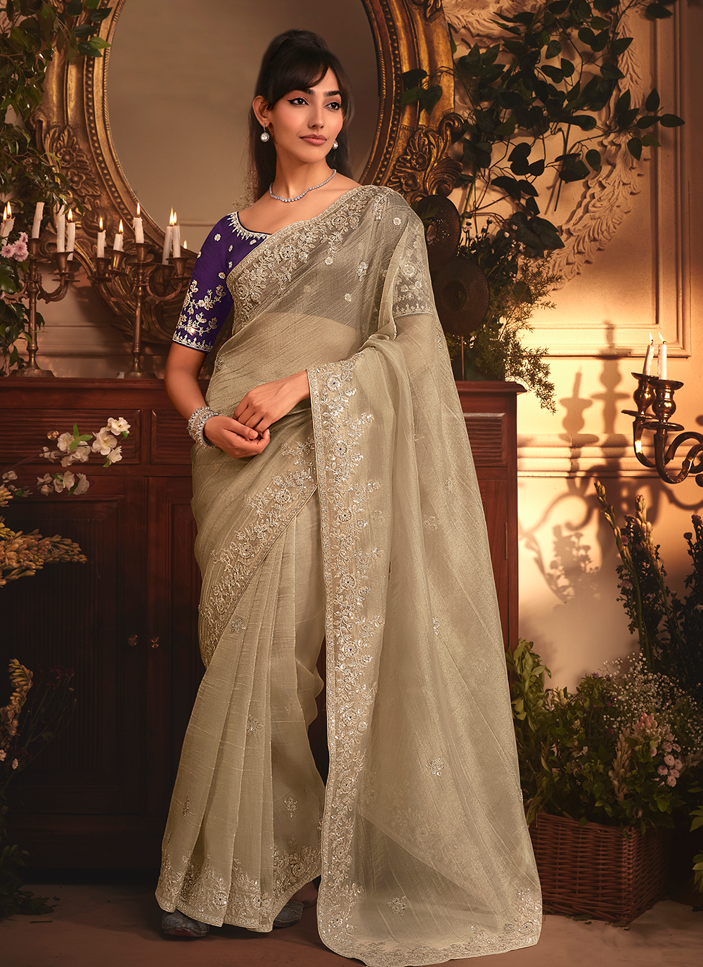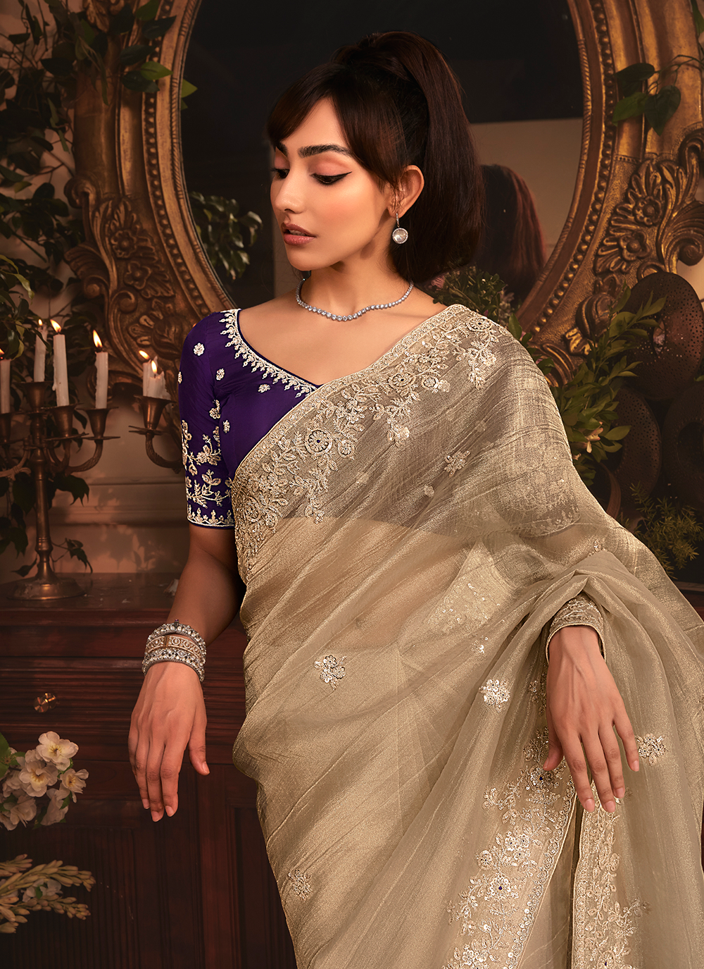 Elevate your festive wardrobe with this stunning Beige Organza Tissue Silk Saree, where timeless elegance meets modern flair. Crafted from premium organza tissue silk, this wedding-worthy piece features intricate embroidery and sequin embellishments that create a captivating shimmer. The ornate border, buttis, and pallu are lavishly decorated with zari and resham threads, delivering that coveted luxurious aesthetic. Paired with a matching sequined satin silk blouse, this saree transforms you into the center of attention at any celebration. Perfect for brides and guests alike, it promises to make every moment unforgettable with its sophisticated charm and eye-catching sparkle.