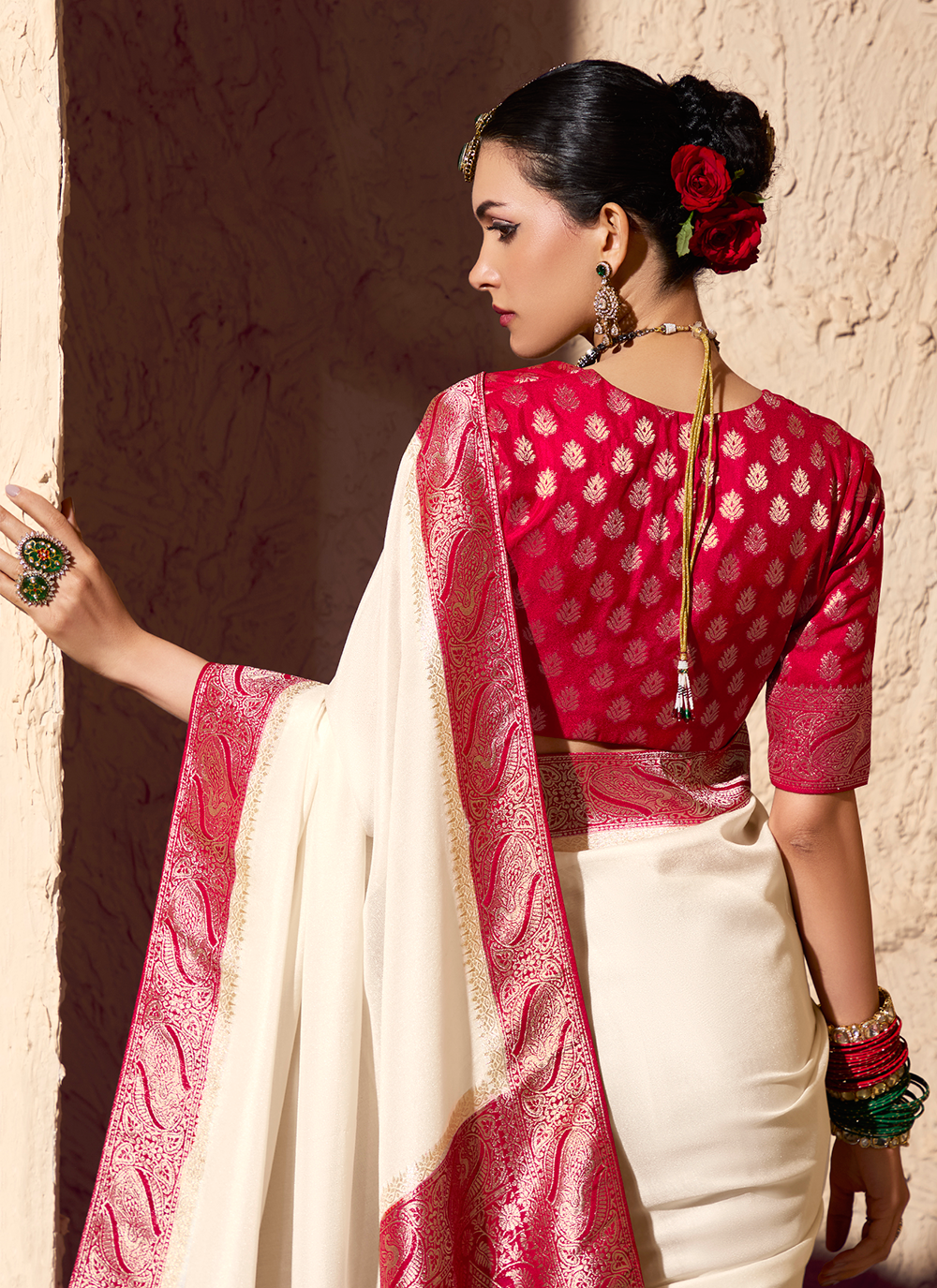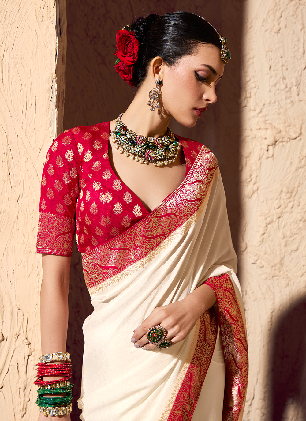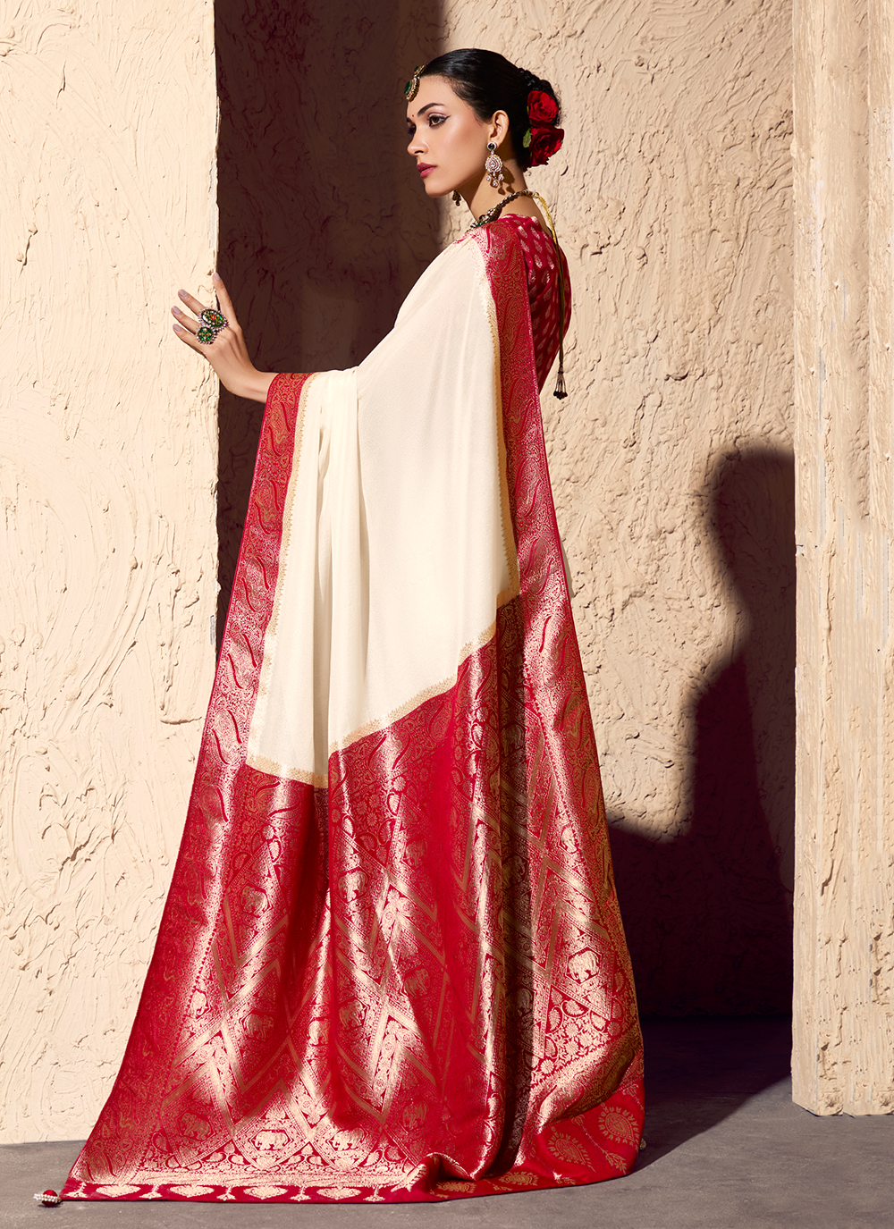 Radiate timeless sophistication in this exquisite Off White and Crimson Red Crepe Georgette Saree, your go-to choice for festive celebrations and memorable occasions. Crafted from premium pure crepe georgette, it showcases masterful zari brocade artistry in striking contrasting shades that elegantly adorn the fabric and refined border. The pallu features captivating, vibrant artwork that adds dimension and allure to your entire look. The accompanying crepe georgette blouse, beautifully embellished with traditional brocade motifs, creates a harmonious, graceful ensemble that moves with ease and elegance. Perfect for festivals, family gatherings, and special events, this saree seamlessly blends classic heritage with contemporary comfort. Complete your ensemble with traditional jewelry, a polished bun, and fresh flowers for an absolutely stunning, head-turning appearance.