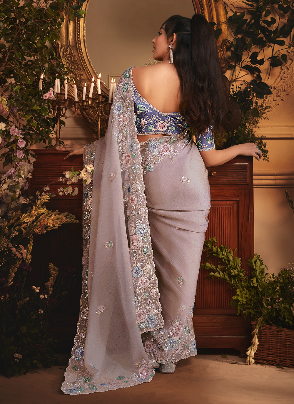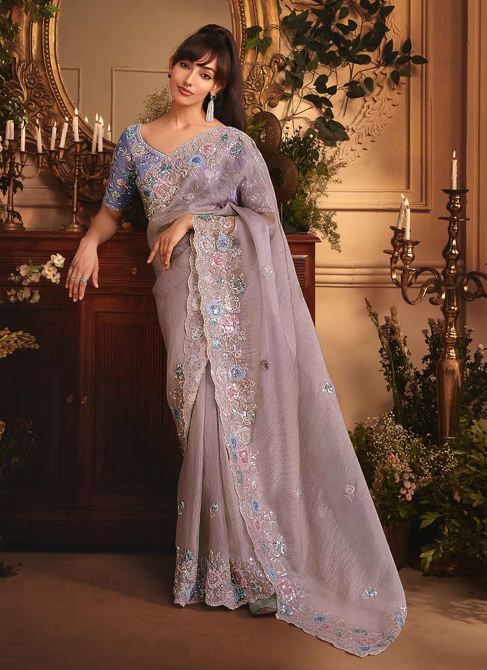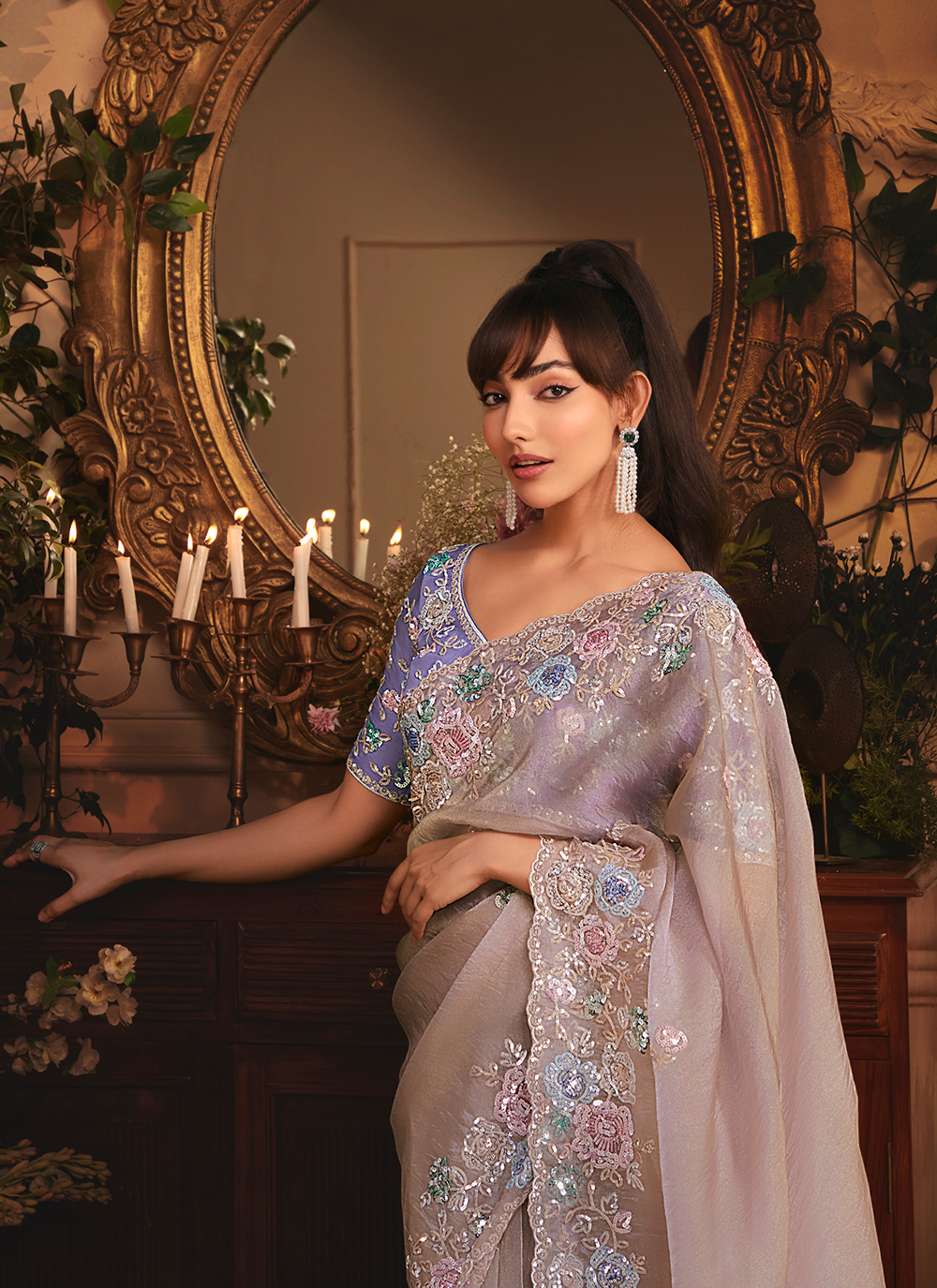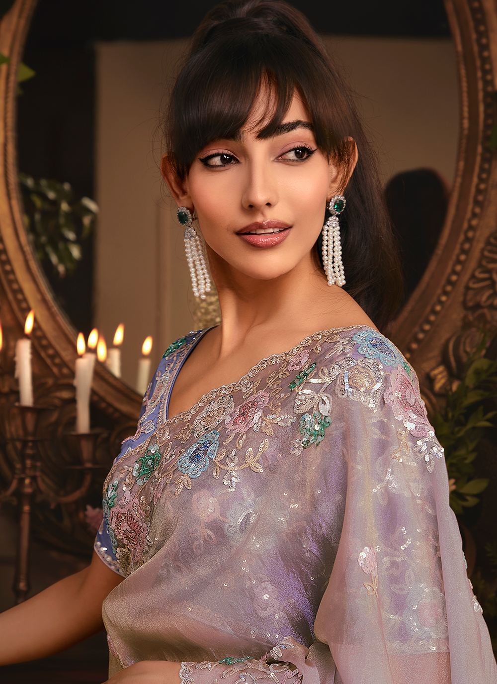 Transform your sangeet night with this exquisite pale mauve organza tissue silk saree that masterfully marries timeless refinement with contemporary flair. Constructed from premium organza tissue silk, it features sophisticated embroidery and graceful embellishments that beautifully complement your silhouette. Ideal for weddings and festive celebrations, the luminous border, scattered buttis, and ornate pallu are lavishly embellished with zari, resham threads, and sequins for an undeniably luxurious aesthetic. Paired with a sequined satin silk blouse, this captivating ensemble radiates elegance infused with vibrant energy. Complete your look with statement earrings and a polished braid to make an unforgettable statement.