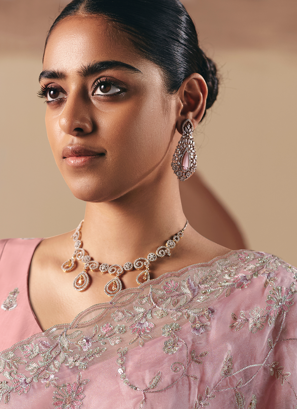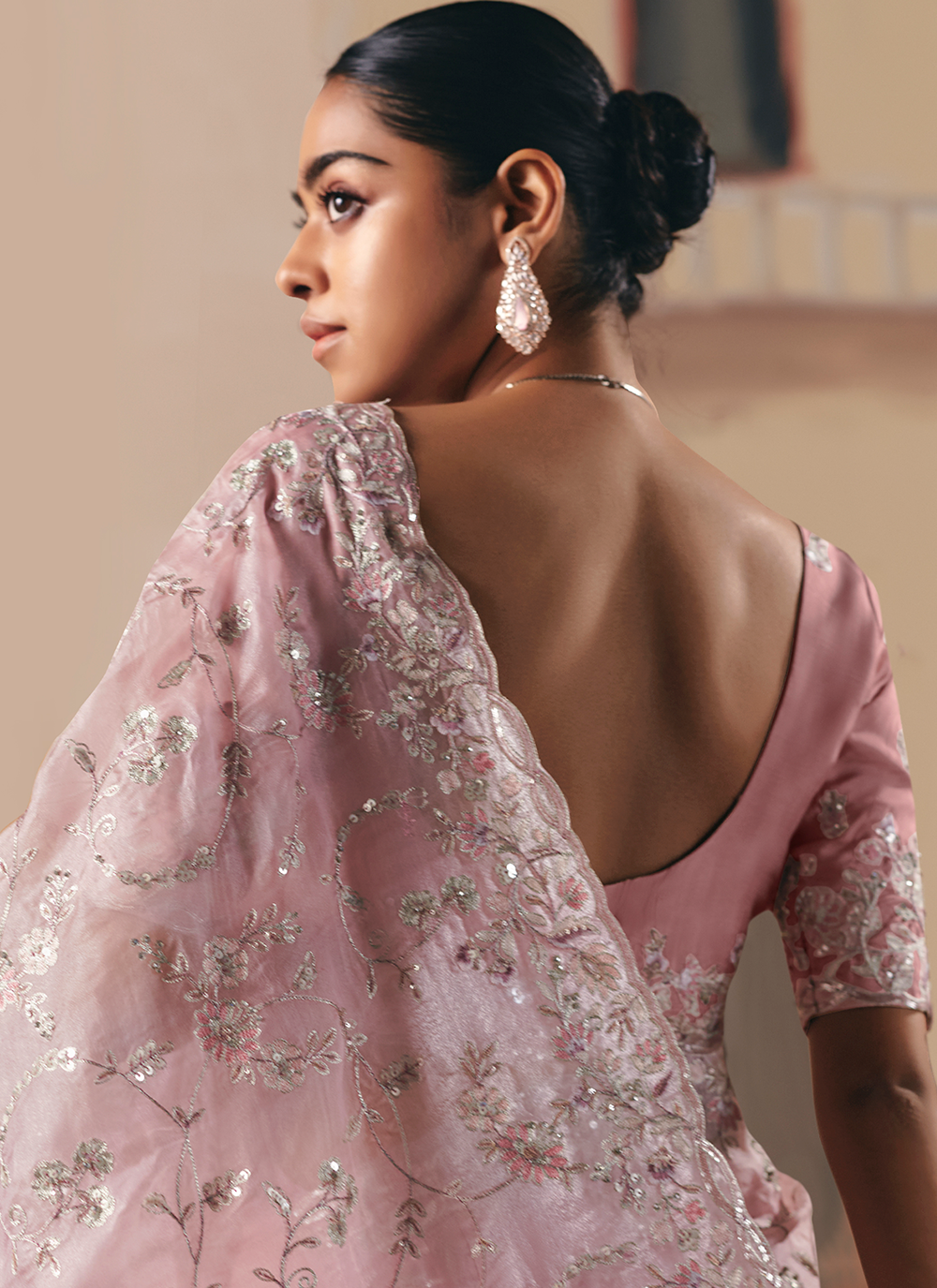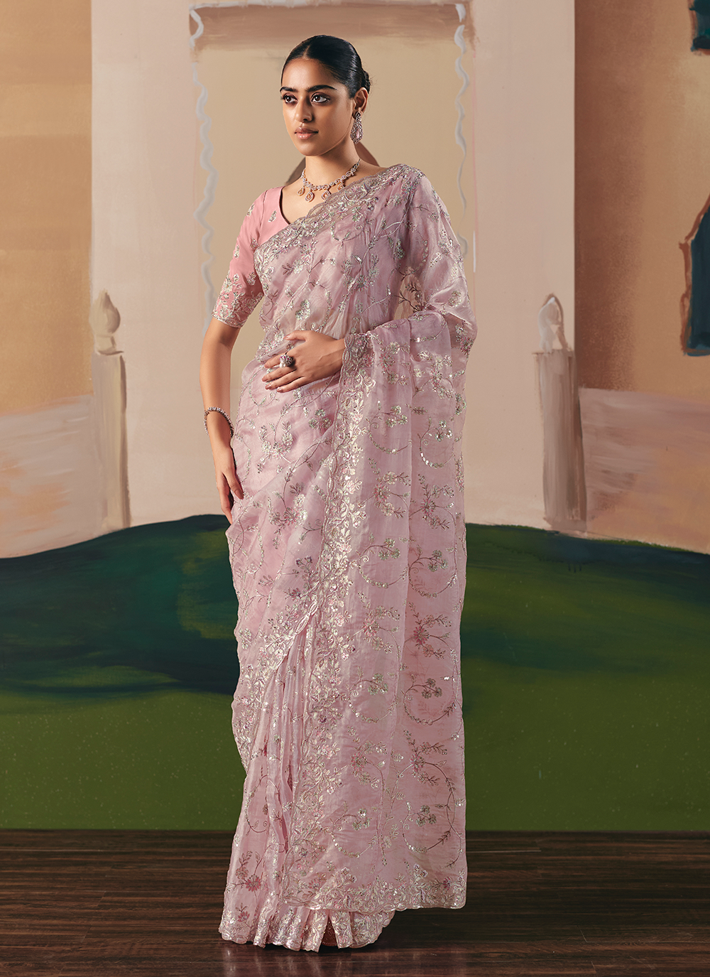Radiate timeless sophistication in this exquisite Pink Reception Saree, where artisanal craftsmanship meets refined elegance. Fashioned from luxuriously soft organza tissue silk, the saree features meticulously hand-embroidered designs that gracefully complement every body type. The richly adorned border, daman, and pallu showcase vibrant resham threads, dazzling sequins, and delicate beadwork that create an enchanting visual appeal. Paired with a premium satin silk blouse boasting coordinating designer embroidery, this ensemble delivers unparalleled grace and poise. Whether you're attending a wedding, reception, or festive celebration, this saree empowers you to make a memorable impression. Elevate your look with striking statement jewelry, an elegant braid, and sophisticated heels for an absolutely captivating appearance.
