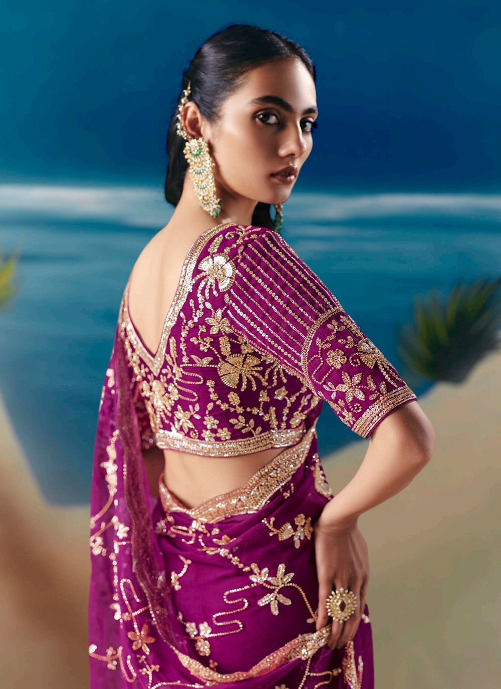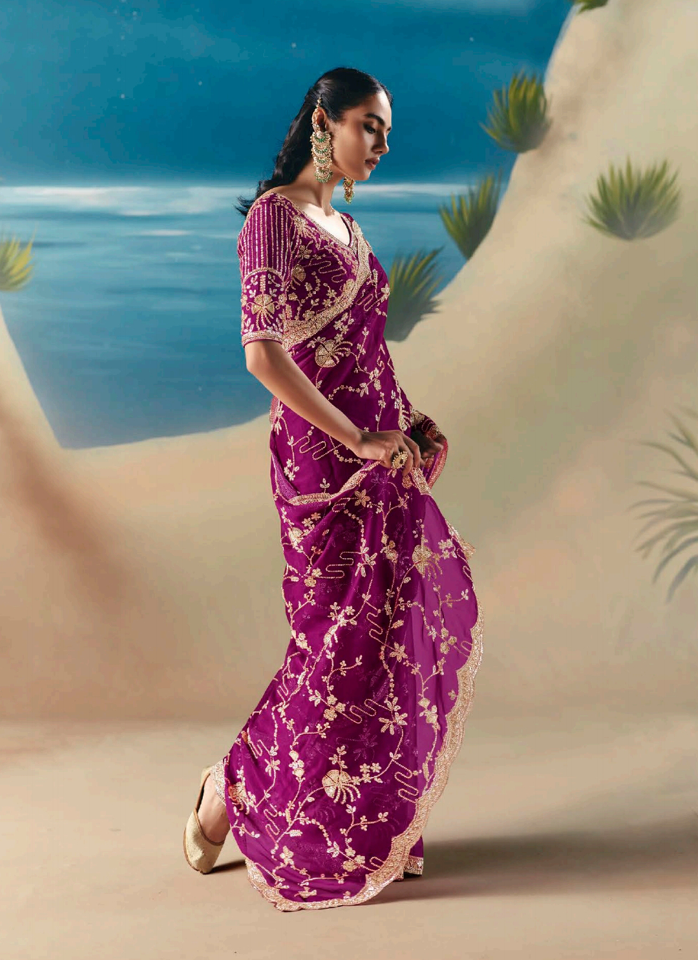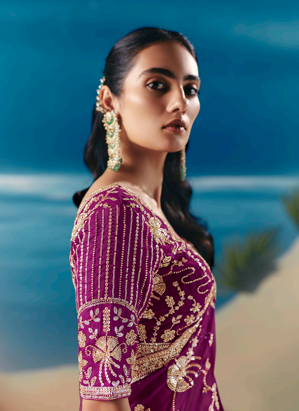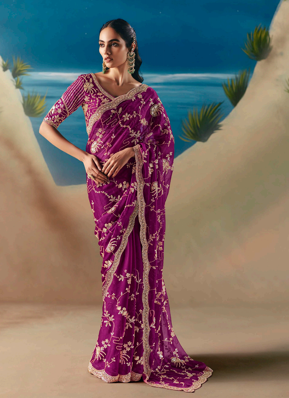 Elevate your festive wardrobe with this stunning Plum Purple Designer Saree, a masterpiece of refined craftsmanship. Woven from premium fancy organza tissue silk, this wedding-worthy ensemble drapes beautifully while showcasing intricate traditional embroidery. Every detail speaks luxury—the border, pallu, and hem are adorned with resham thread, golden zari, pearl beads, sequins, and cutdana moti work that catches light with every movement. The coordinating silk blouse features elaborate embellishments across the sleeves, neckline, and back, seamlessly blending timeless heritage with contemporary style. Whether you're attending a wedding, celebration, or special evening event, this saree promises to make you feel absolutely radiant and unforgettable.