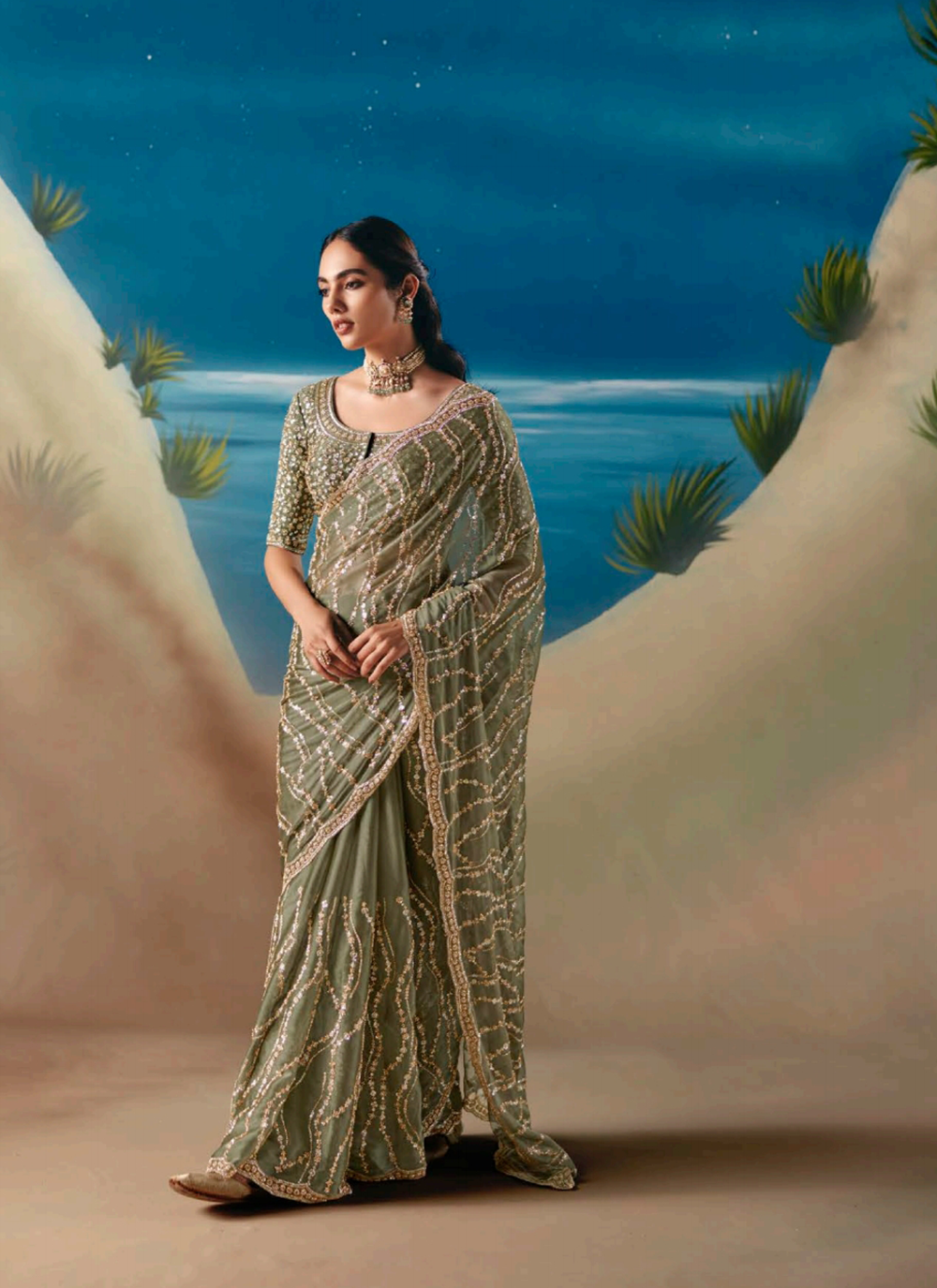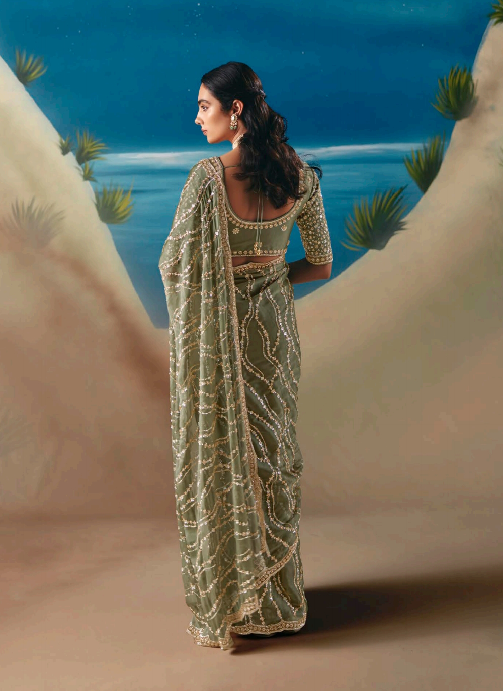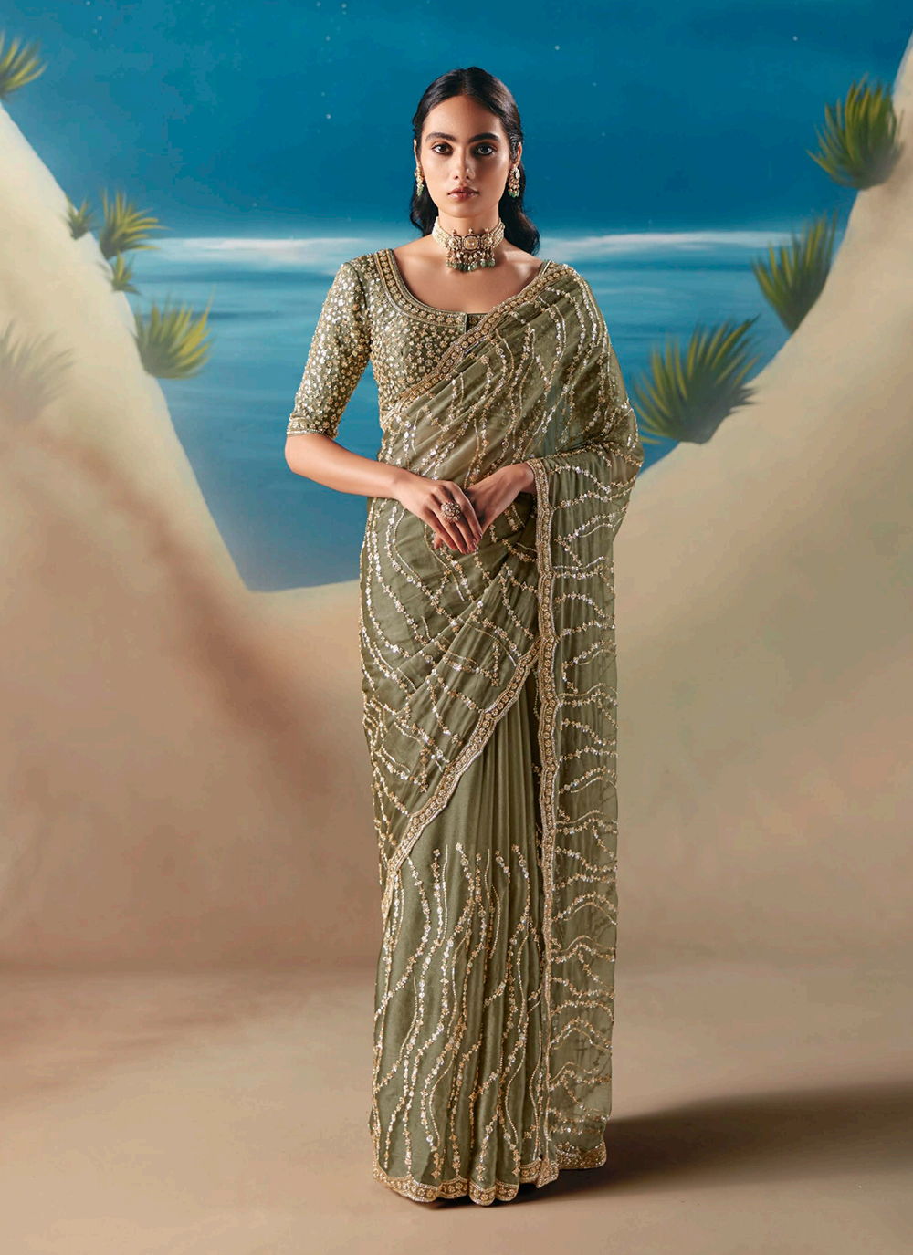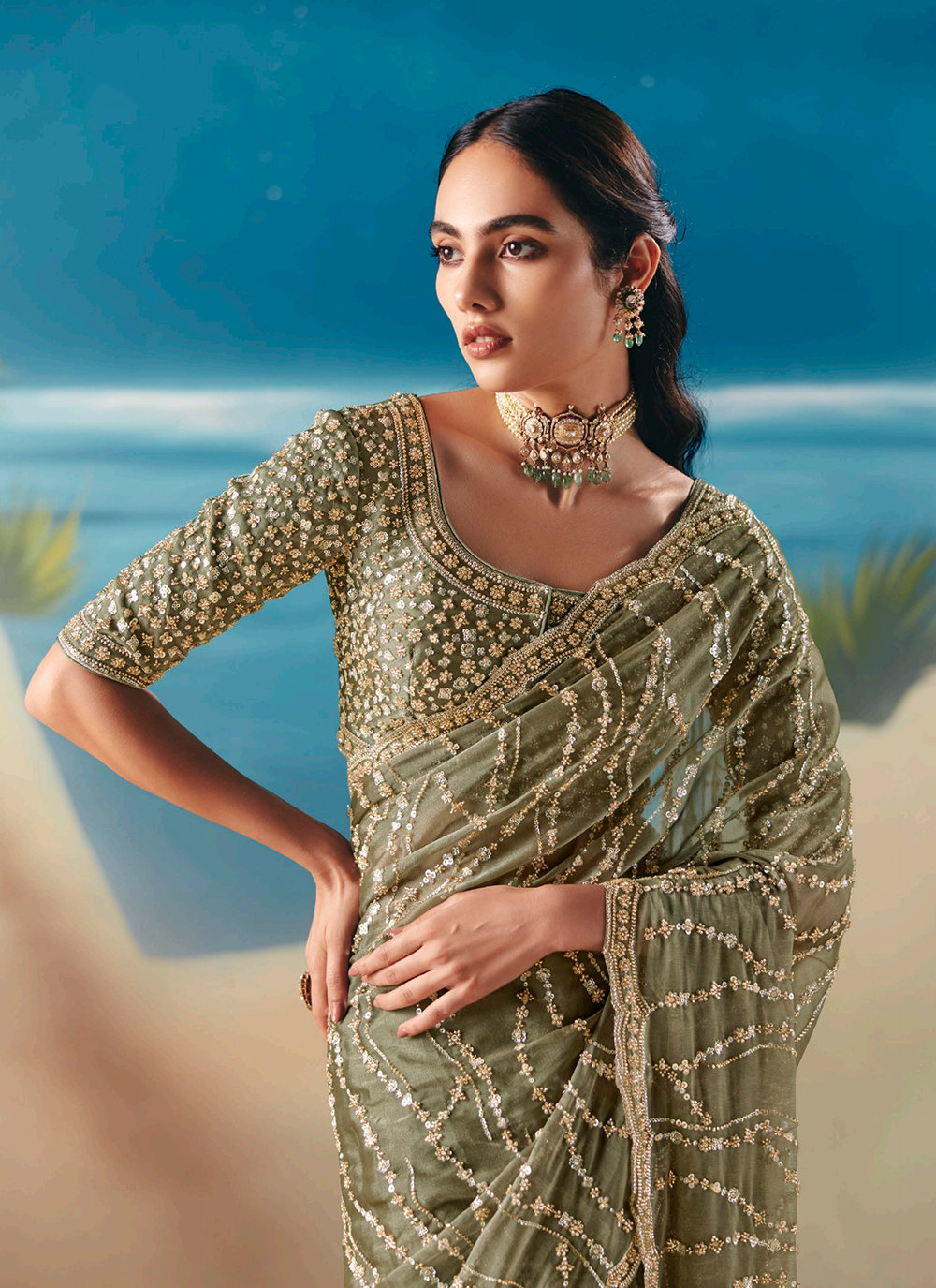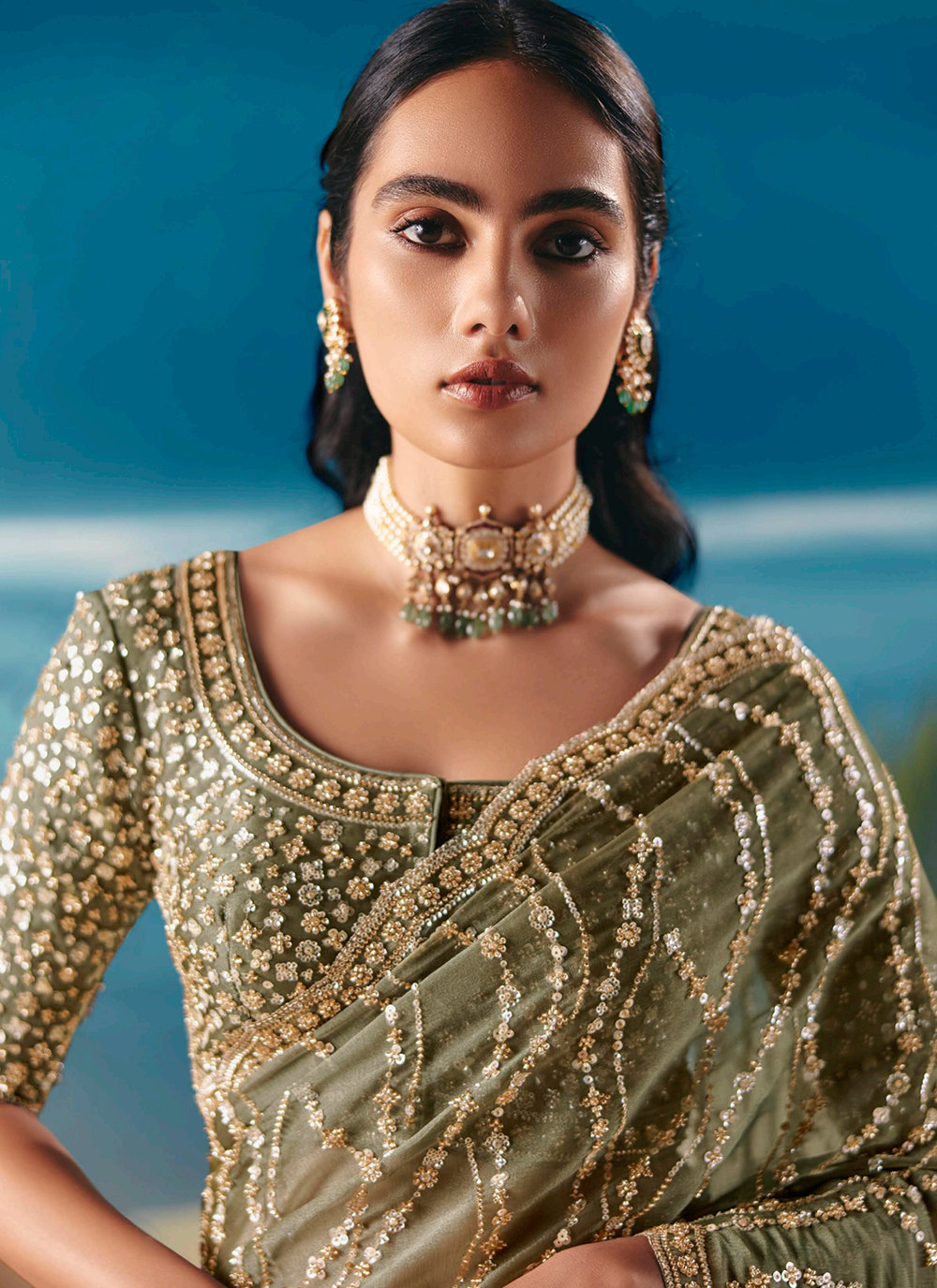 Elevate your festive wardrobe with this stunning Sage Green Fancy Organza Tissue Silk Saree, designed for the discerning woman who refuses to compromise on sophistication. Woven from premium fabric that flows effortlessly, this reception-ready ensemble showcases intricate traditional embroidery across the border, hem, and pallu—adorned with resham thread, golden zari, lustrous pearl beads, sequins, and cutdana moti for an undeniably luxurious finish. The coordinating heavy blouse features exquisite embellishment on the sleeves, neckline, and back, seamlessly merging timeless craftsmanship with contemporary allure. Whether you're attending a wedding, celebrating a special occasion, or making an entrance at an evening event, this saree promises to make you the center of attention. Pair with statement jewelry and elegant heels to complete your show-stopping look.