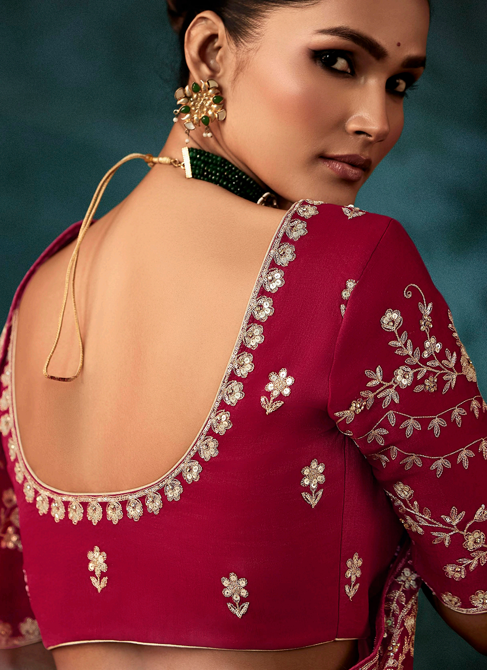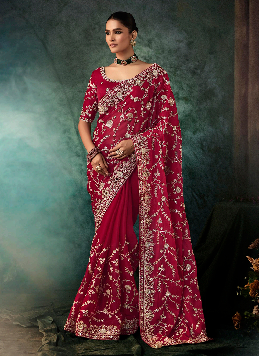 Elevate your bridal ensemble with this stunning Cherry Red wedding saree that captures timeless elegance. Crafted from luxurious pure crepe silk, this masterpiece showcases exquisite golden zari embroidery intricately woven with shimmering sequins, lustrous pearl beads, and sparkling crystal stones throughout the drape. The ornately embellished pallu and border feature traditional handwork detailing that commands attention. The coordinating designer crepe silk blouse is adorned with meticulous embroidery across the neckline, front, and sleeves, creating a harmonious, polished look. Ideal for weddings, receptions, and cherished celebrations, this saree delivers sophisticated glamour with every wear. Pair with Kundan jewelry and delicate heels to complete your refined bridal transformation.
