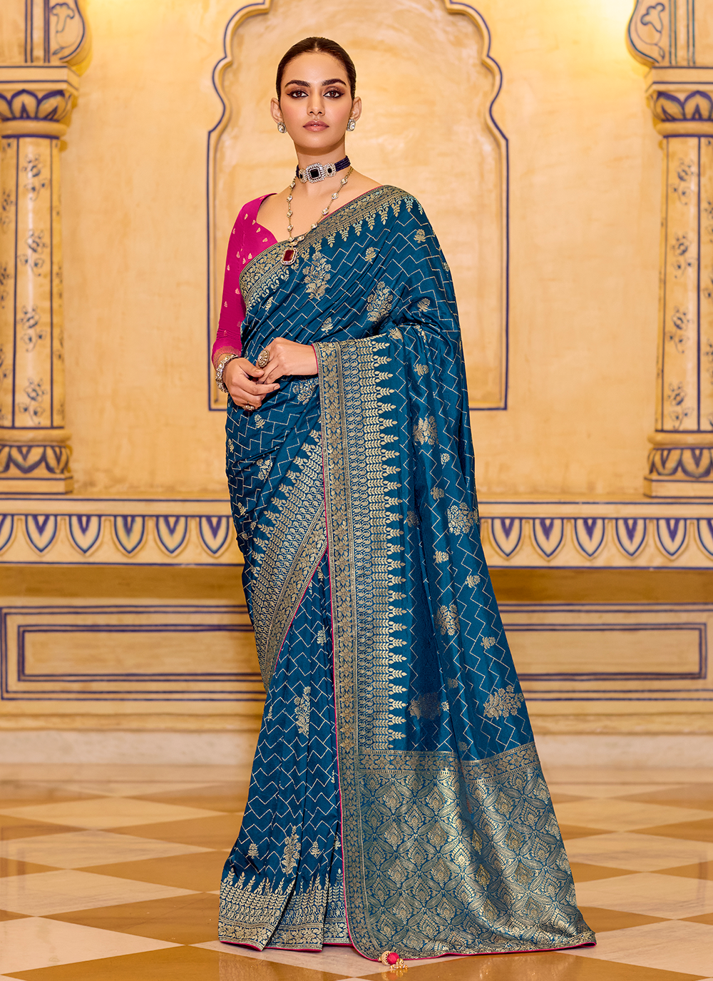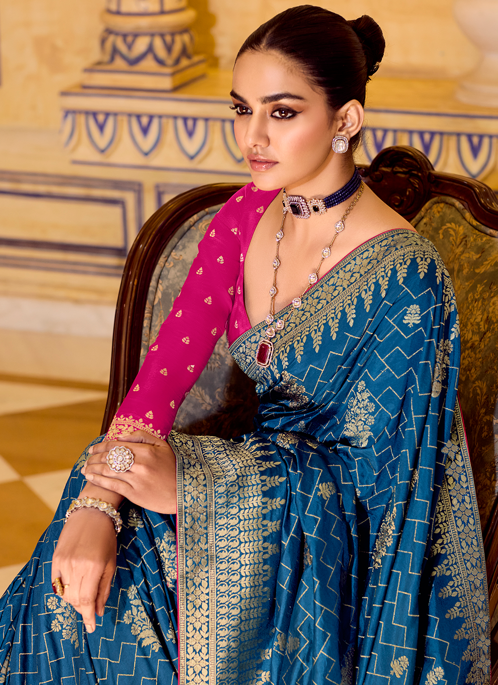 Make a bold statement with this stunning blue and rani pink crepe silk saree, designed for those who embrace timeless glamour. This Bollywood-inspired piece showcases magnificent zari brocade detailing with shimmering crystal accents that sparkle with every movement. The intricately woven pallu becomes the focal point of your ensemble, while the coordinating crepe silk blouse features traditional brocade patterns for a seamless, refined look. Perfect for festive celebrations, weddings, and special occasions, this saree captures the essence of classic elegance. Elevate your style with traditional jewelry, a sleek updo, and fresh florals to create an unforgettable impression.