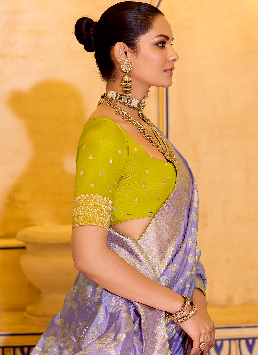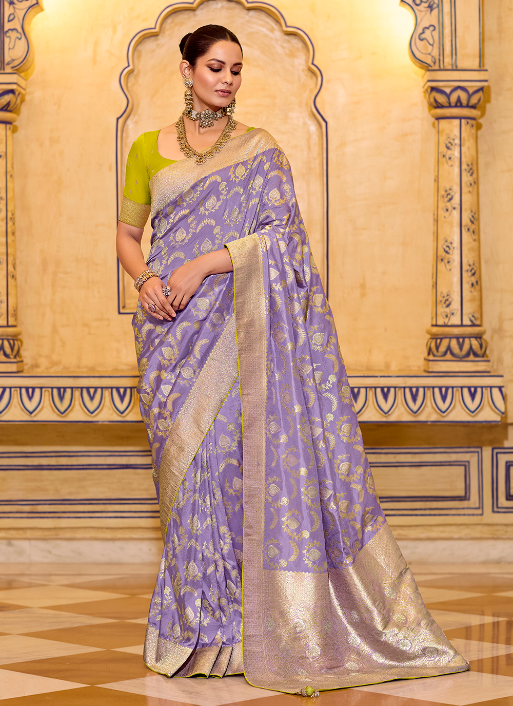Captivate with understated charm in this exquisite lavender and lime green crepe silk saree, designed for engagement celebrations and milestone moments. This sophisticated piece features magnificent zari brocade motifs with shimmering crystal stonework that adds luminous beauty to the pure silk fabric. The intricately woven pallu serves as an elegant focal point, while the coordinating crepe silk blouse showcases traditional brocade embellishments for a harmonious, refined look. Perfect for engagements, festive occasions, and special celebrations, this saree embodies graceful sophistication. Complete your ensemble with traditional jewelry, a sleek updo, and fresh florals to create an unforgettable impression.