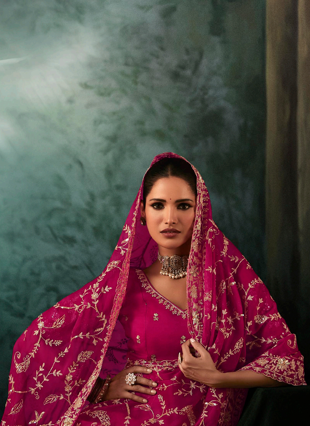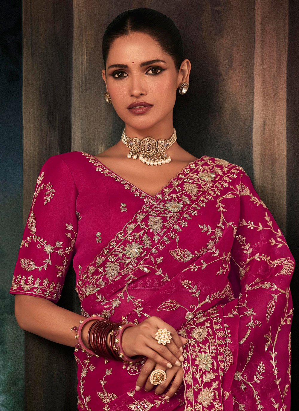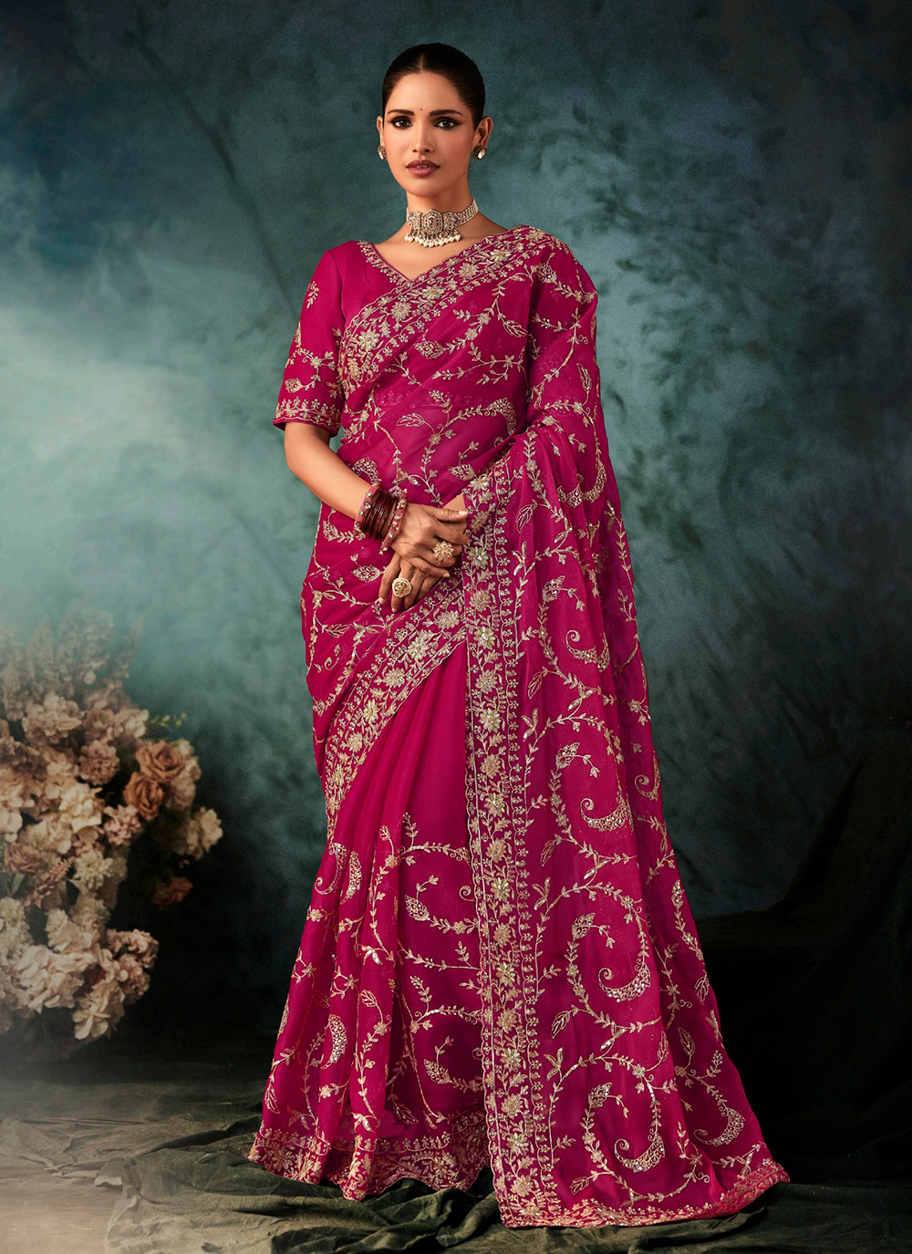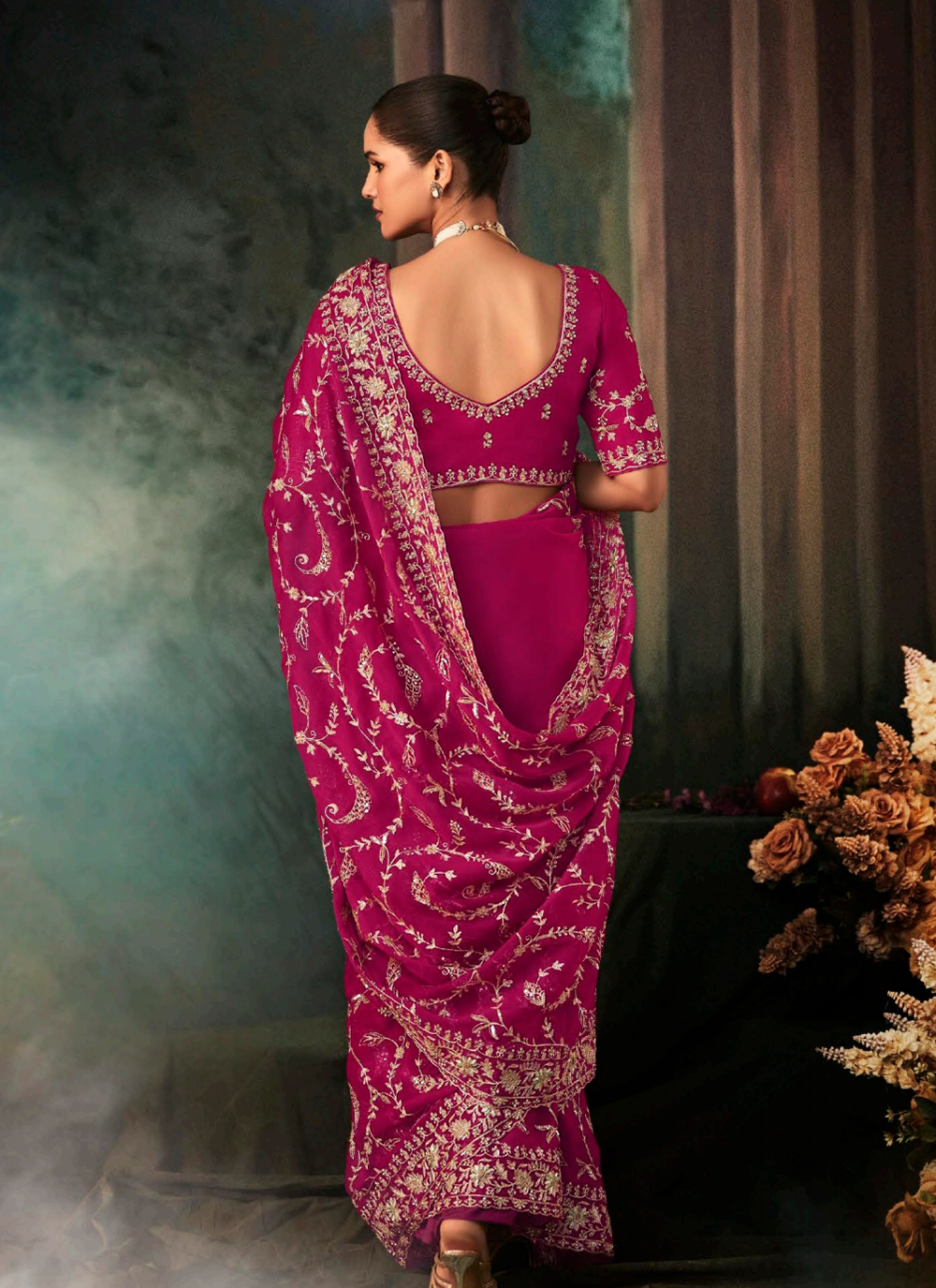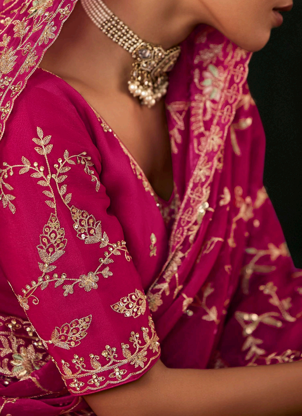 Magenta Pink Bridal Wear Handwork Embroidery Sequins Crepe Saree