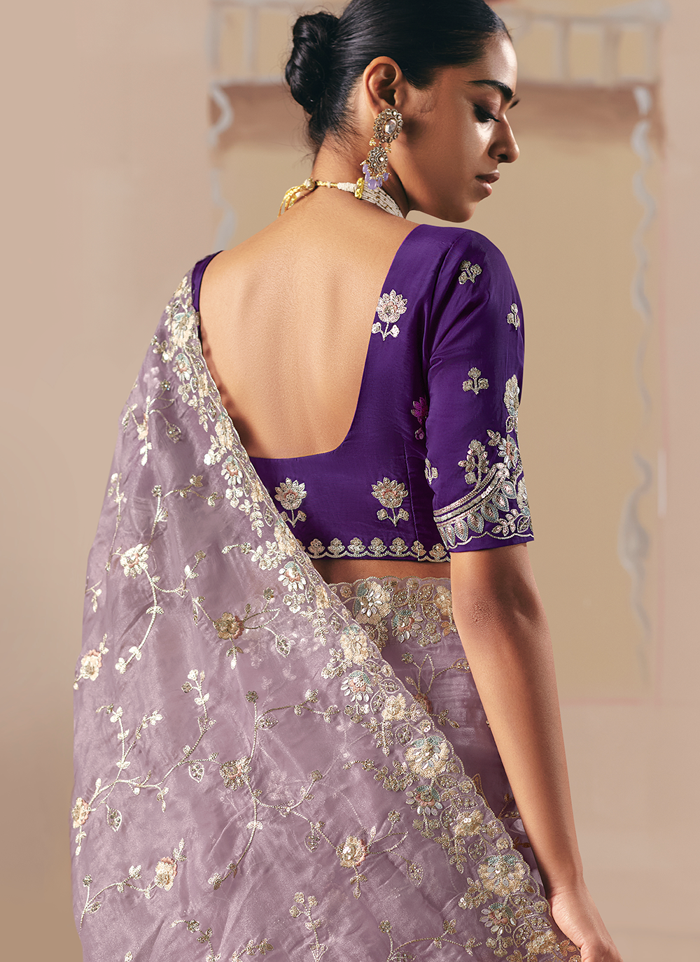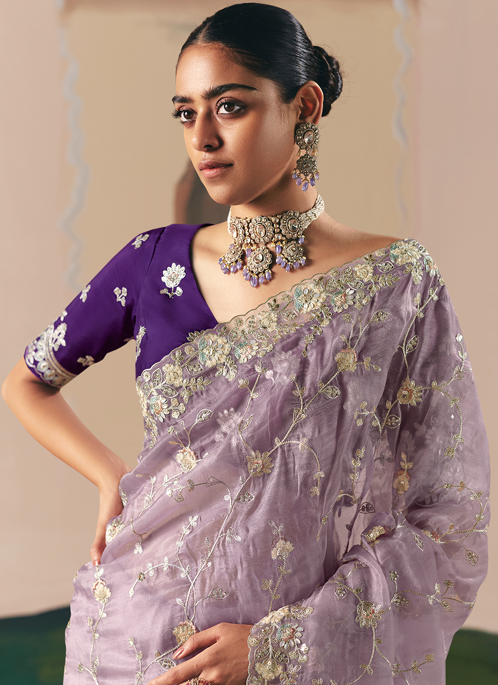 Lavender Organza Tissue Silk Embroidered Saree Indian Wedding Occasion Wear | 3 | Siya Fashion
