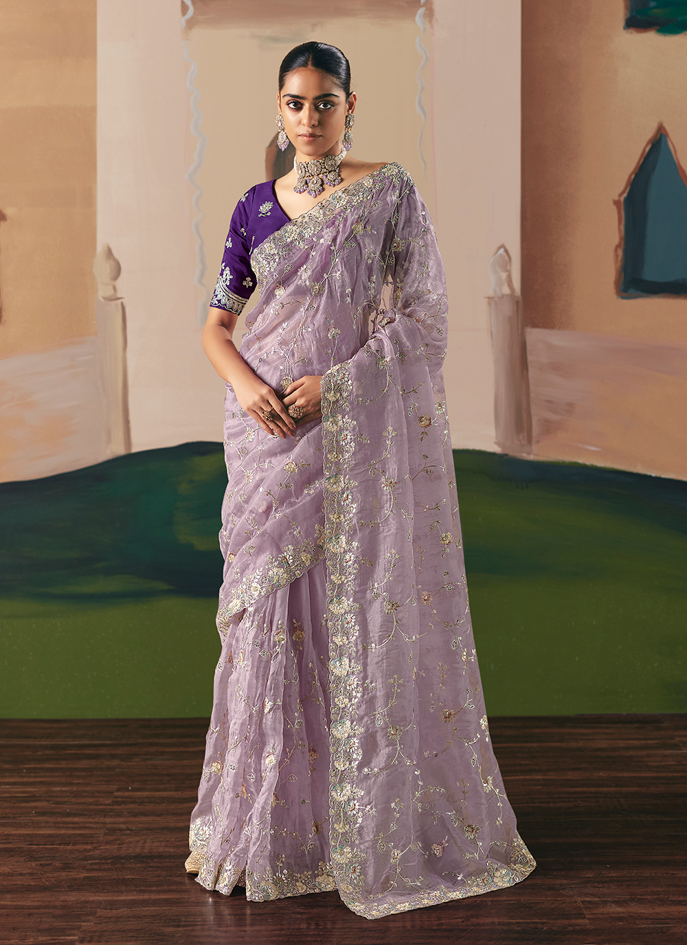 Elevate your festive wardrobe with this exquisite Lavender Organza Tissue Silk Saree, where timeless Indian craftsmanship meets contemporary elegance. Skilled artisans have meticulously hand-embroidered delicate motifs across the luxuriously crinkled organza fabric, creating a silhouette that drapes beautifully and complements all body types. The ornate border, daman, and pallu showcase vibrant resham threadwork, shimmering sequins, and intricate beadwork that catch light with every movement. Paired with an intricately embroidered satin silk blouse, this saree commands attention at weddings, receptions, and celebrations. Style it with statement jewelry and elegant heels to complete your show-stopping ensemble.