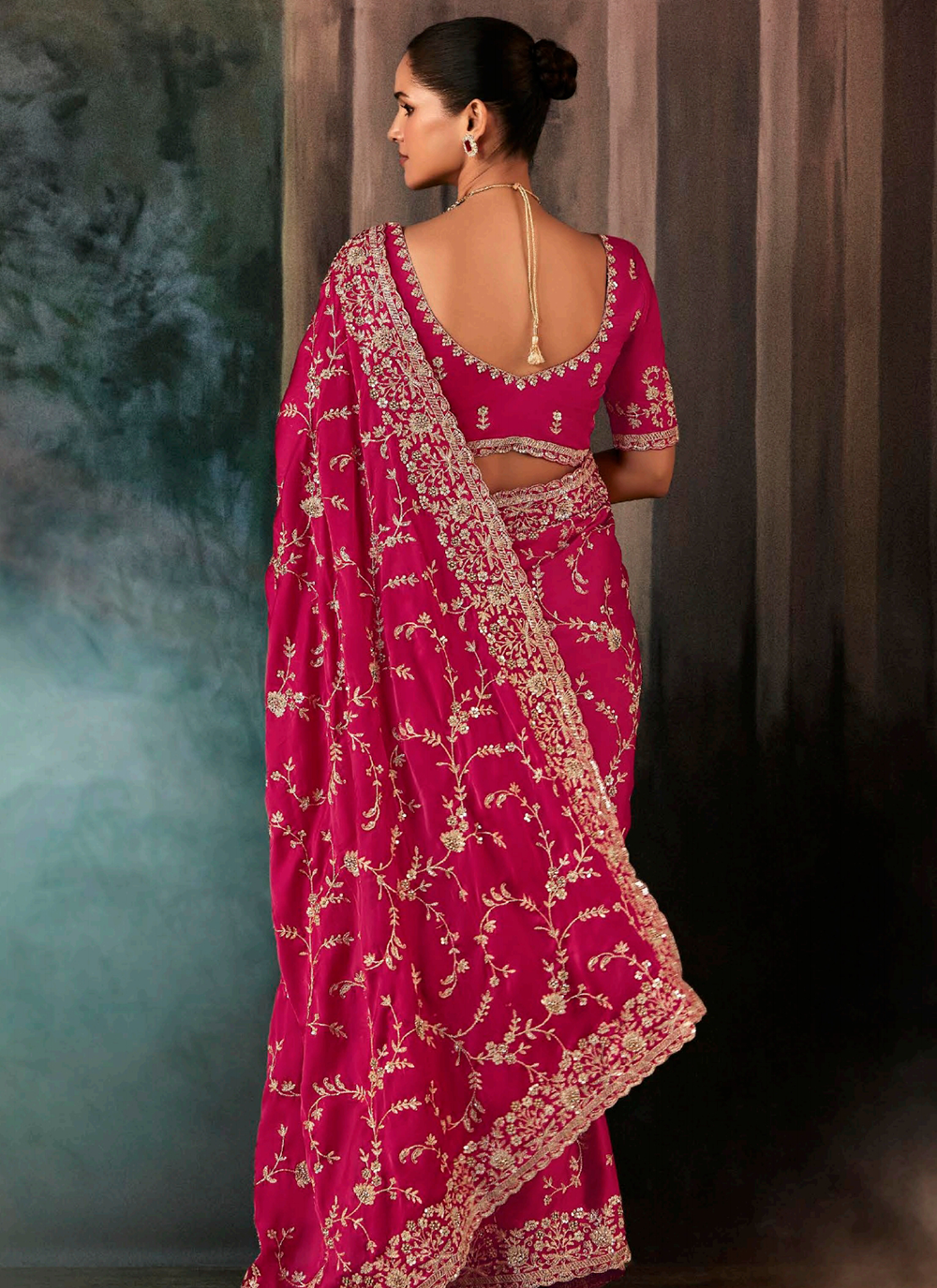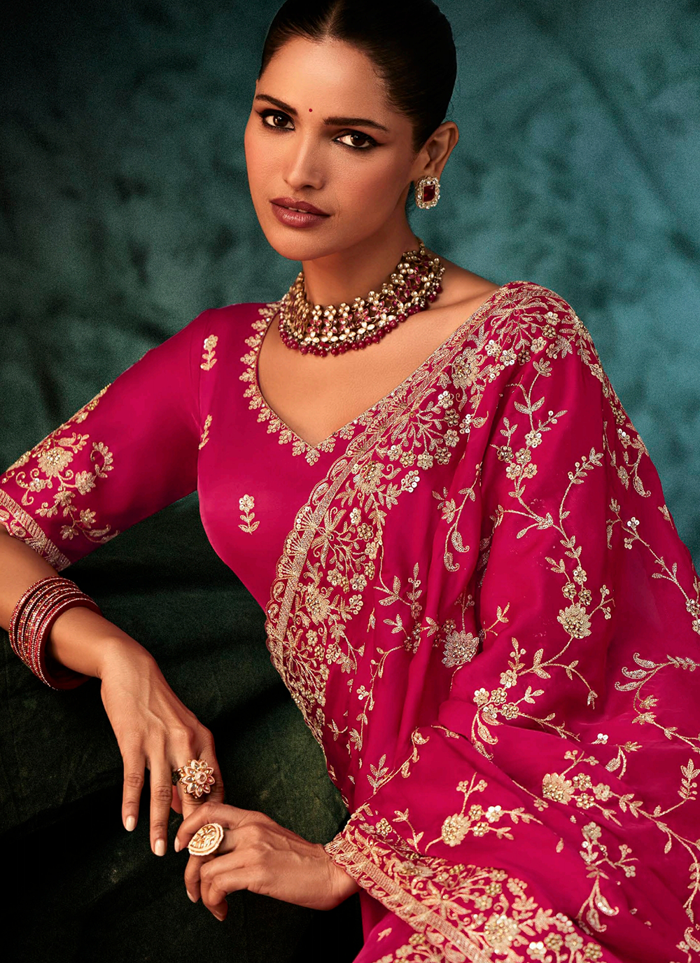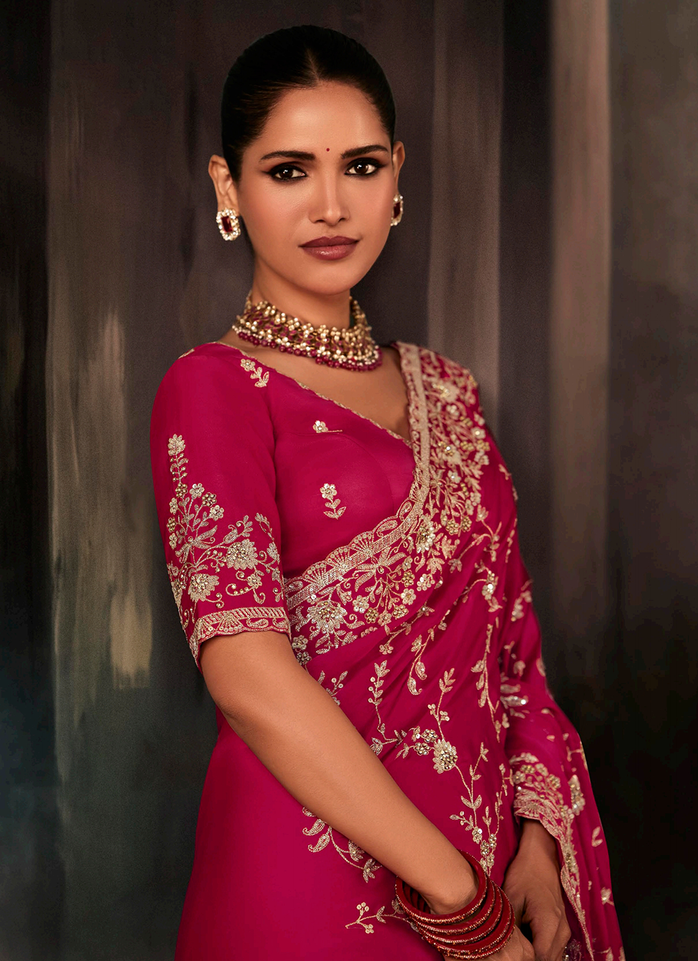Make a striking impression in this luxurious dark pink bridesmaid saree, expertly crafted from premium satin silk. Adorned with magnificent handwork featuring golden zari, resham thread, sequins, pearl beads, and gleaming crystal stones, every inch of this saree radiates sophistication. The richly embroidered pallu and heavily detailed border showcase traditional artistry, while the coordinating designer blouse features exquisite embellishment across the neckline, front, and sleeves for a perfectly harmonized ensemble. Ideal for weddings, receptions, and festive celebrations, this piece delivers the refined glamour and polished elegance you seek. Pair with Kundan jewelry and delicate heels to complete your stunning look. This comprehensive set includes both the saree and matching embellished blouse, making it your go-to choice for memorable occasions.