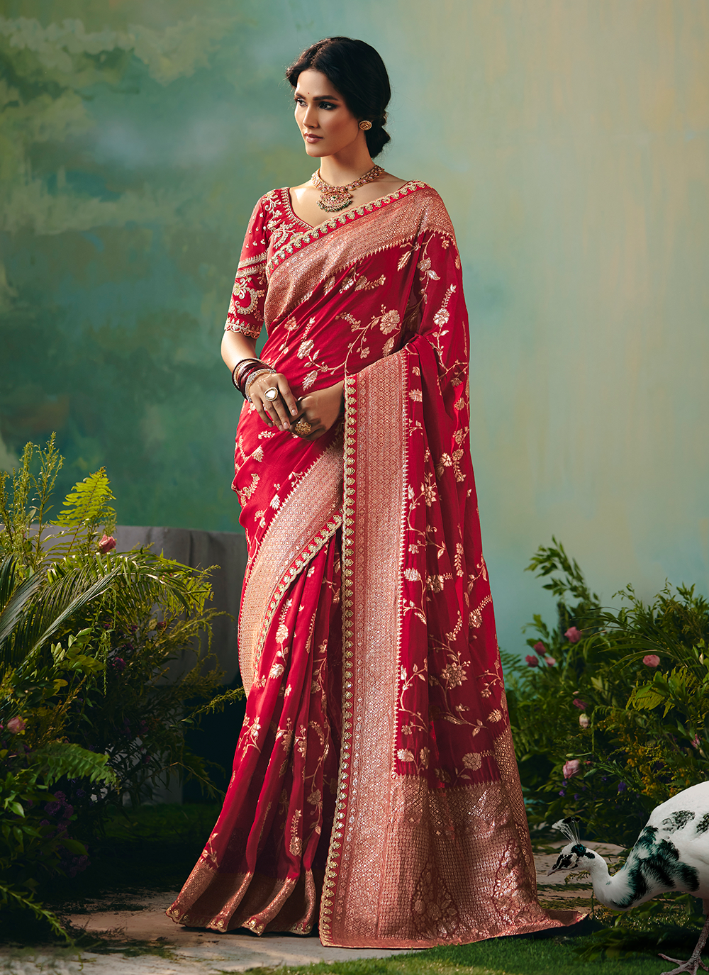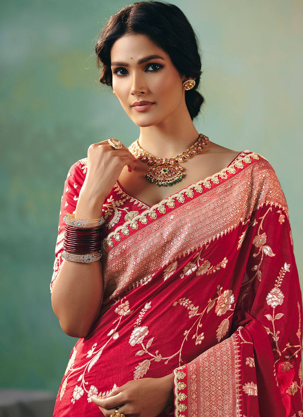 Designer Bridal Red Zari Weaving Dola Viscose Silk Wedding Wear Saree