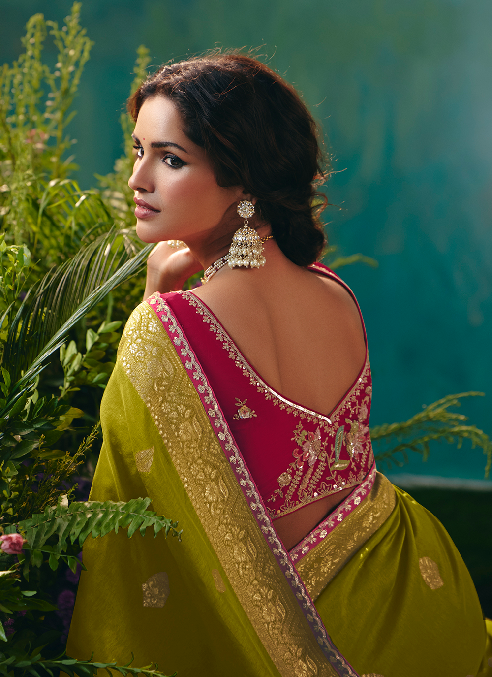 Experience sophisticated allure with this stunning Olive Green Dola Viscose Silk Saree, a wedding-occasion treasure paired with a vibrant Magenta embroidered blouse. The premium silk fabric showcases intricate golden zari weaving and a striking pink border that radiates opulent beauty. Supple and graceful, the fabric drapes flawlessly to enhance your silhouette while providing exceptional comfort throughout your celebration. The ornate embroidery on the magenta blouse creates a captivating color harmony that seamlessly merges traditional artistry with modern elegance. Perfect for weddings, festive gatherings, and cultural events, this versatile ensemble ensures you stand out with timeless sophistication and refined style. Accessorize with bold jewelry and elegant heels to complete your unforgettable look.