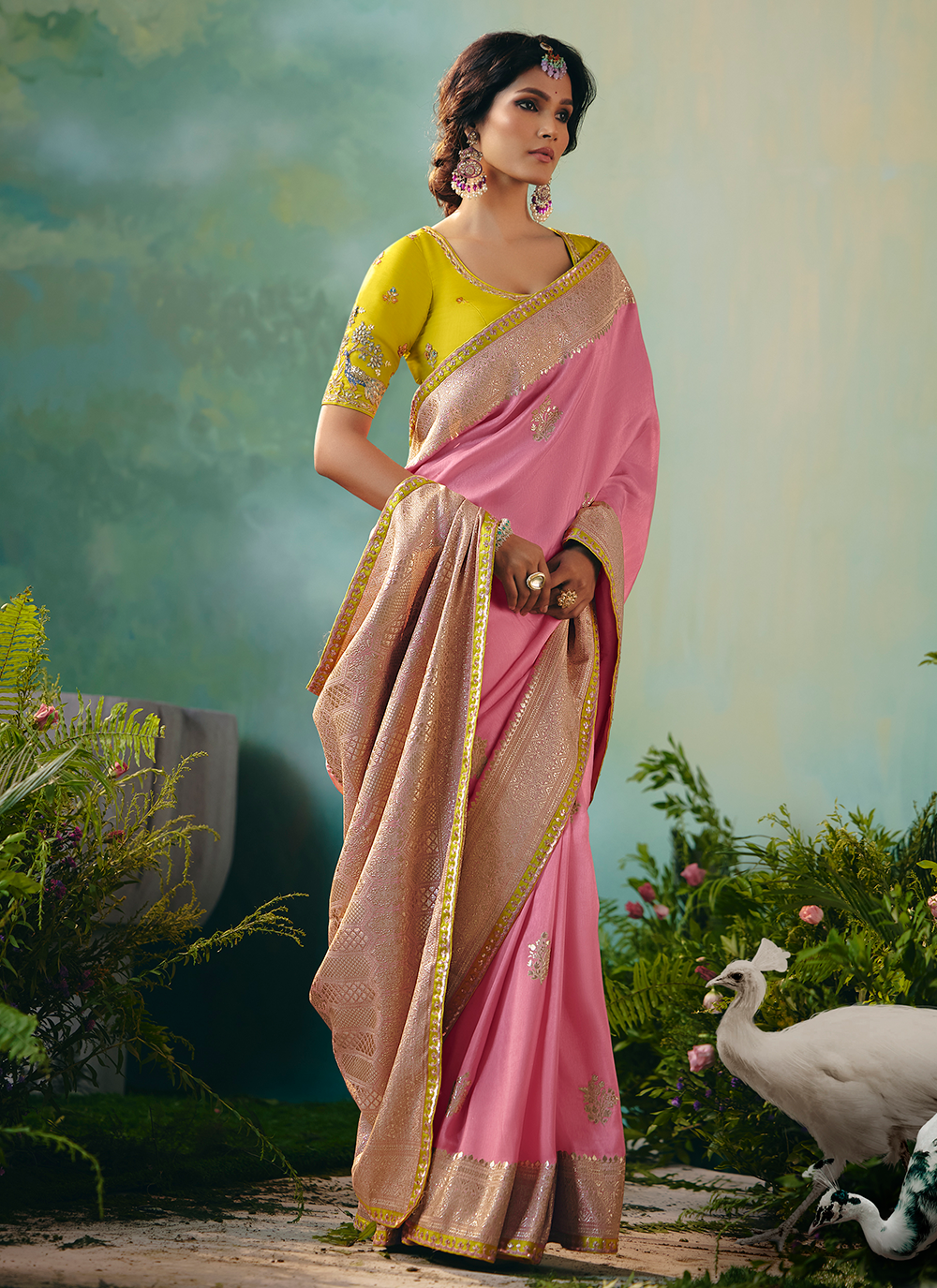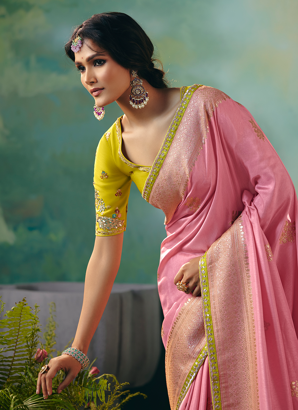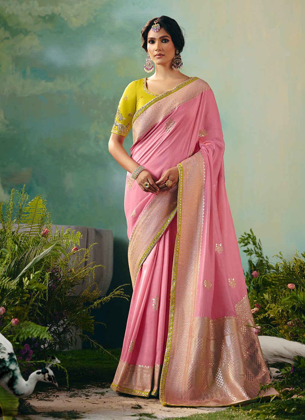 Indulge in timeless sophistication with this exquisite Pink Dola Viscose Silk Saree, a reception-ready masterpiece adorned with lustrous golden zari weaving and a shimmering luminous border. The delicate pink fabric exudes grace and refinement, while the vibrant Lime Yellow designer blouse creates a bold, contemporary contrast that captivates at every glance. Perfect for weddings, bridesmaids, festive celebrations, and cultural events, this ensemble seamlessly marries traditional craftsmanship with modern elegance. The premium silk drapes beautifully to enhance your natural beauty while ensuring comfort throughout your special occasion. Elevate your ethnic wardrobe with this versatile piece that commands attention and celebrates your impeccable sense of style.