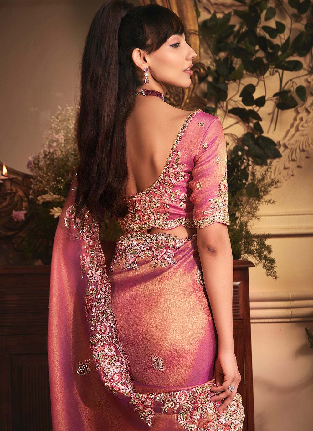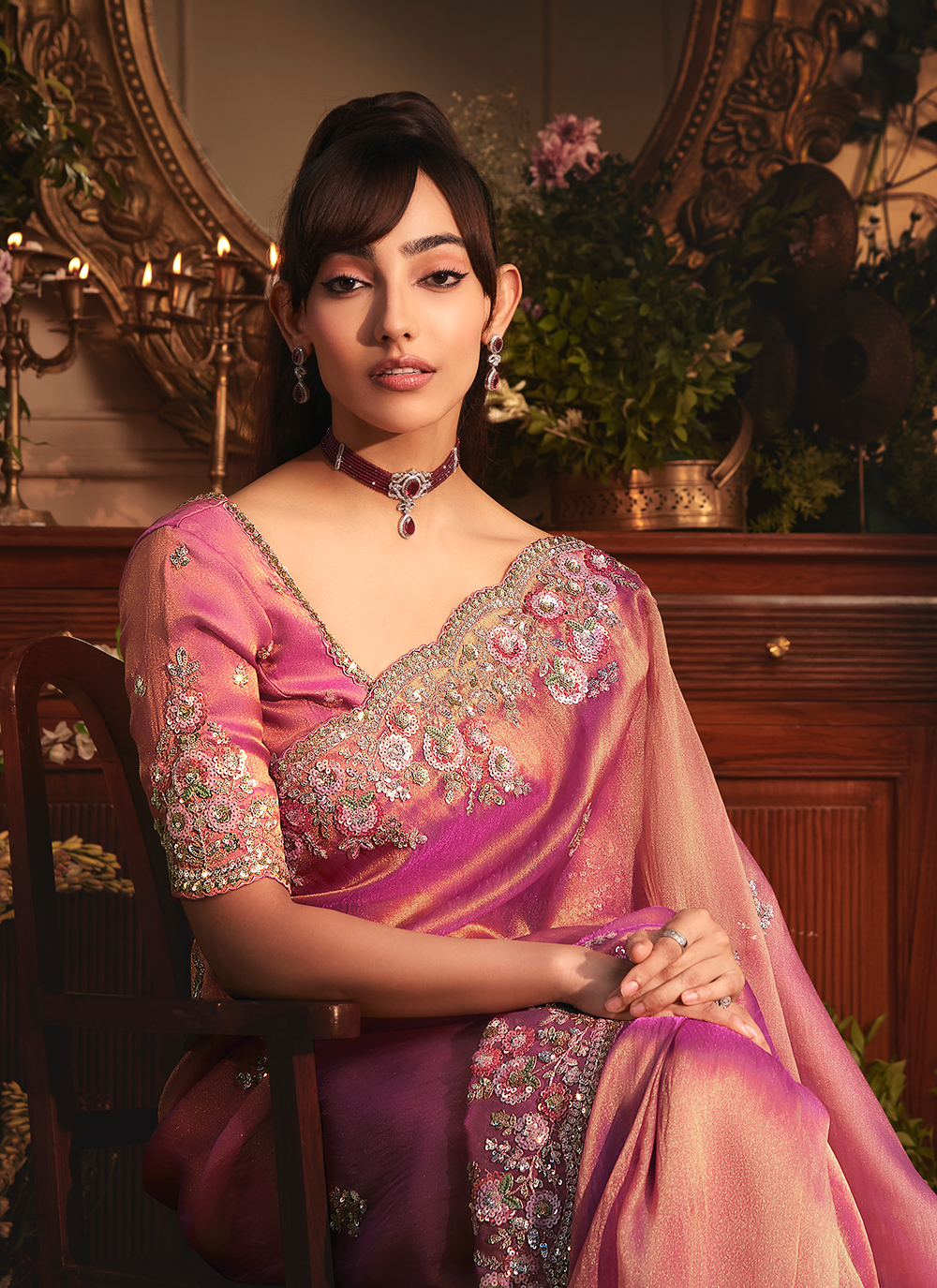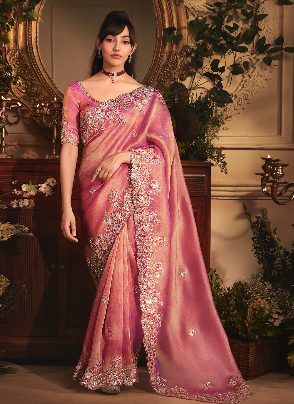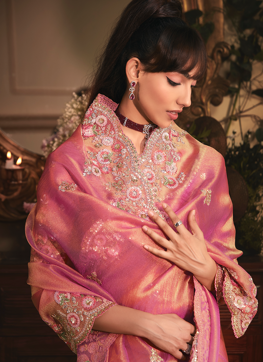 Elevate your special occasion wardrobe with this stunning Pink Dual Tone Tissue Organza Silk Saree—a masterpiece designed for women who demand both luxury and grace. Crafted from premium organza tissue silk, this reception-ready ensemble features intricate embroidery embellished with zari, resham threads, and sequins across the border, buttis, and pallu. The radiant dual-tone palette creates a mesmerizing visual impact, while the accompanying satin silk blouse with sequin detailing completes the sophisticated look. Whether you're attending a wedding or festive celebration, this saree delivers the refined elegance and contemporary charm that transforms any moment into a memorable occasion. Style with statement jewelry and a polished braid to command attention and admiration.