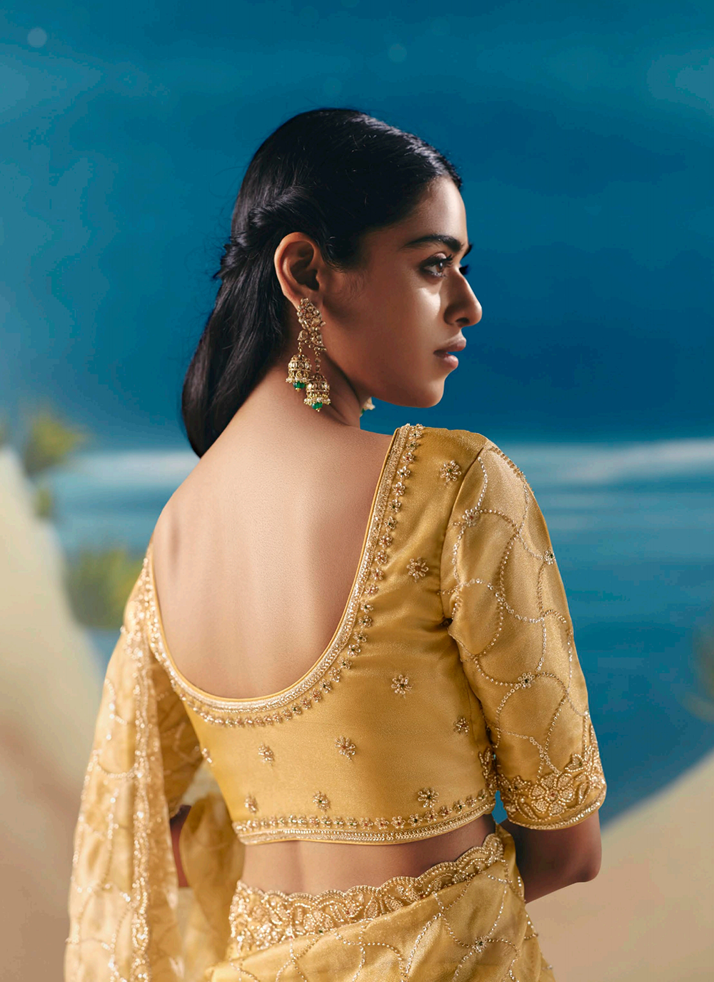 Discover timeless elegance with this radiant Butter Yellow Designer Saree, crafted for the discerning woman. Draped in sumptuous fancy organza tissue silk, it showcases beautifully executed traditional embroidery that captures light and attention. The border, pallu, and hem shimmer with resham thread, golden zari, lustrous pearl beads, sequins, and cutdana moti embellishments that create an undeniably luxurious presence. The accompanying silk blouse features intricate detailing on the sleeves, neckline, and back, seamlessly marrying classic heritage with modern sensibility. Perfect for weddings, celebrations, and evening events, this saree ensures you'll stand out with grace and sophistication.