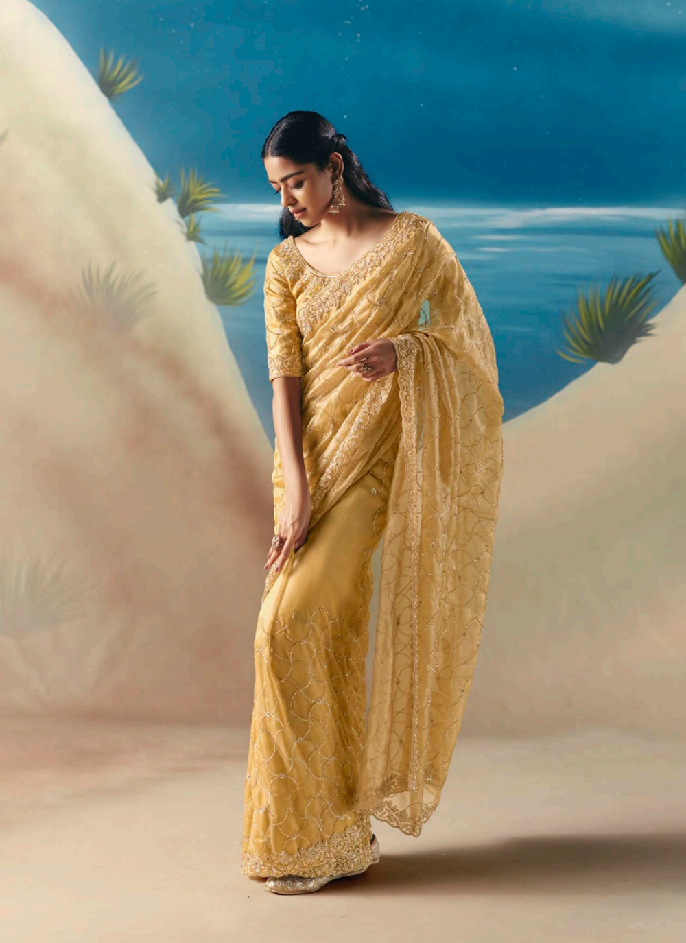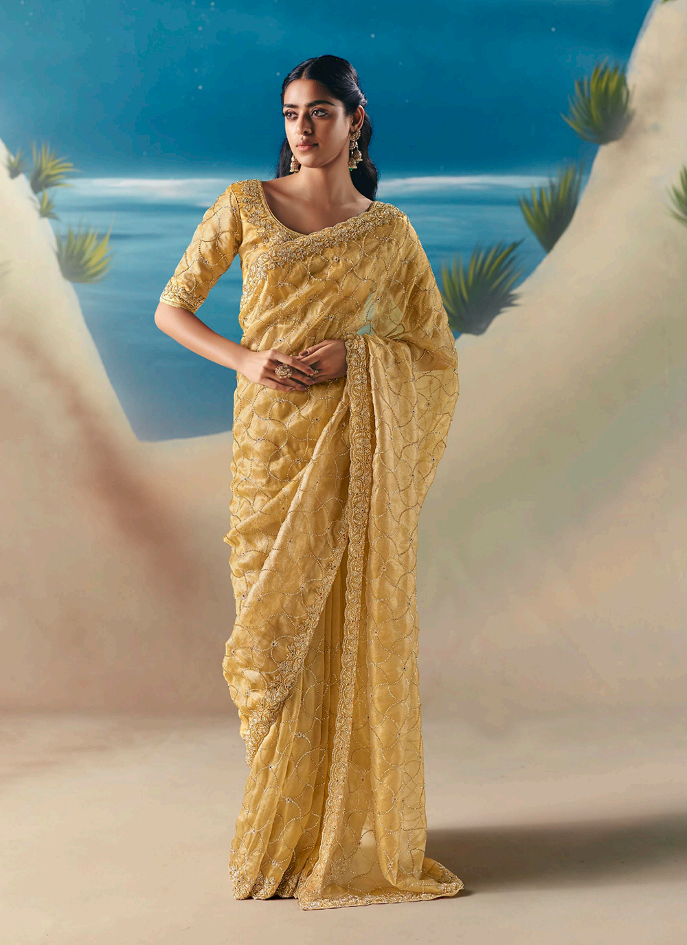 Reception Wear Butter Yellow Embroidered Fancy Organza Tissue Silk Saree | 1 | Siya Fashion