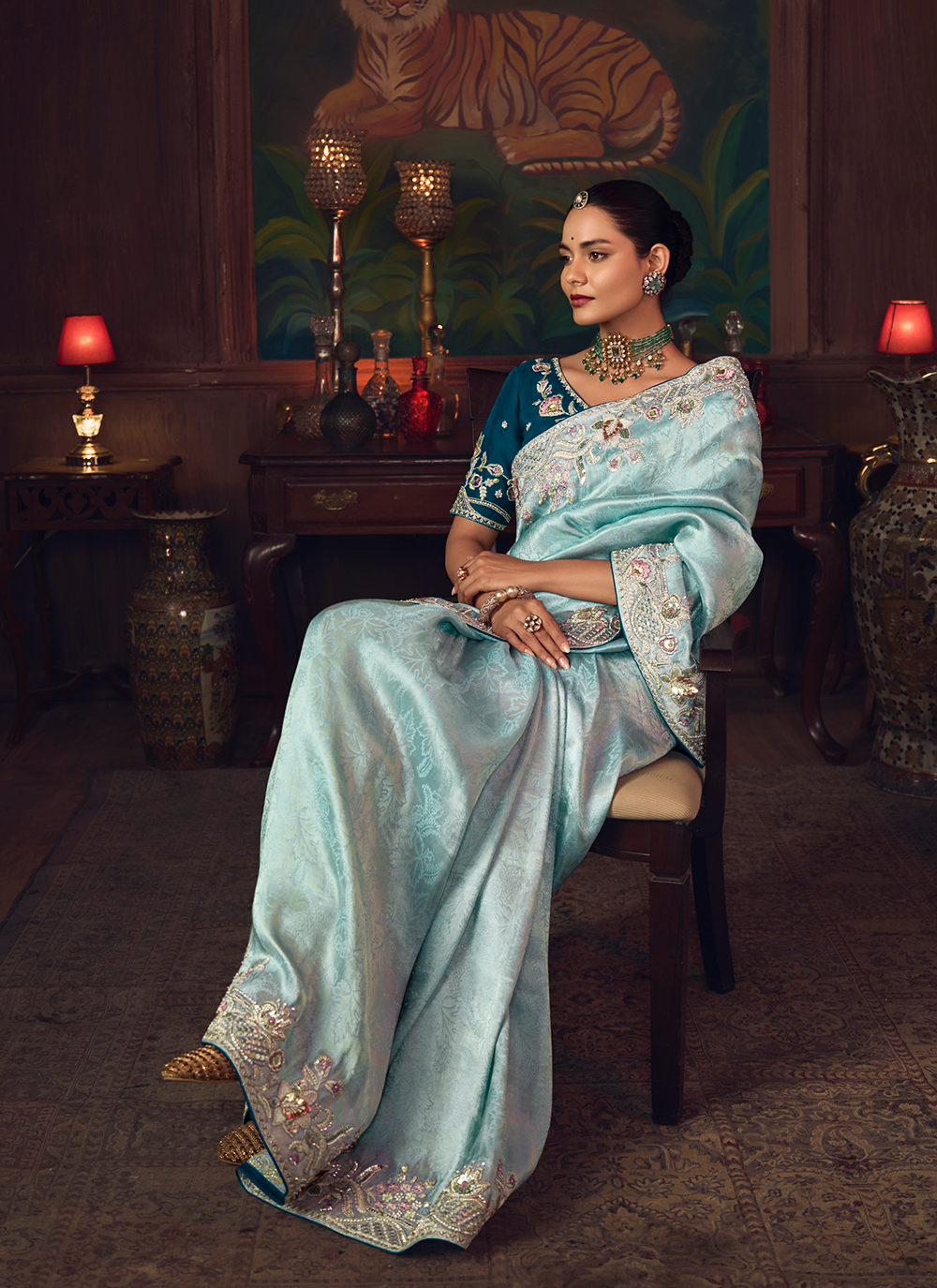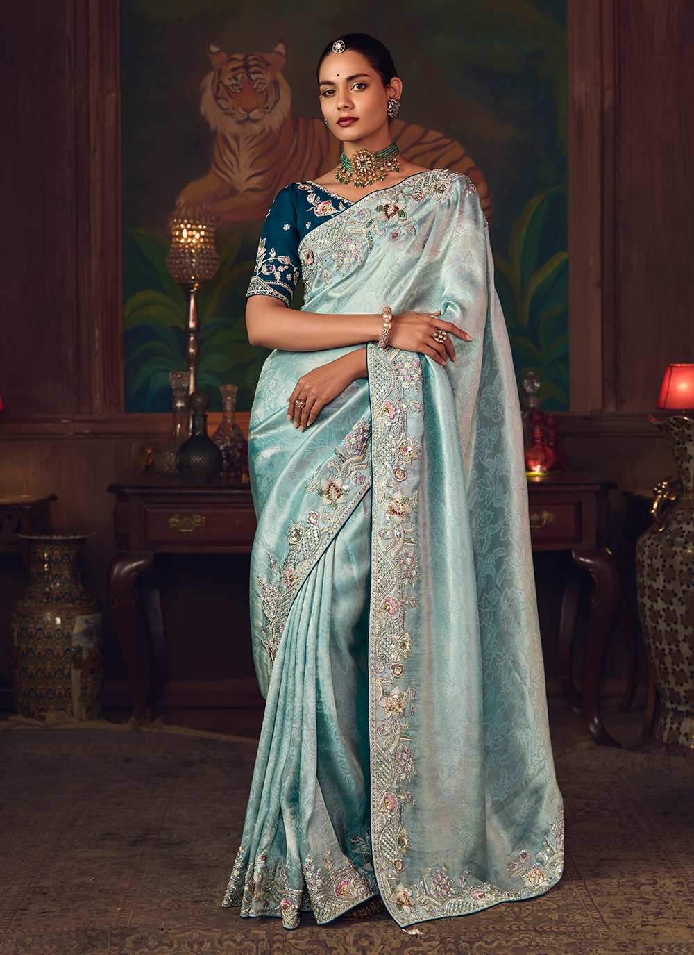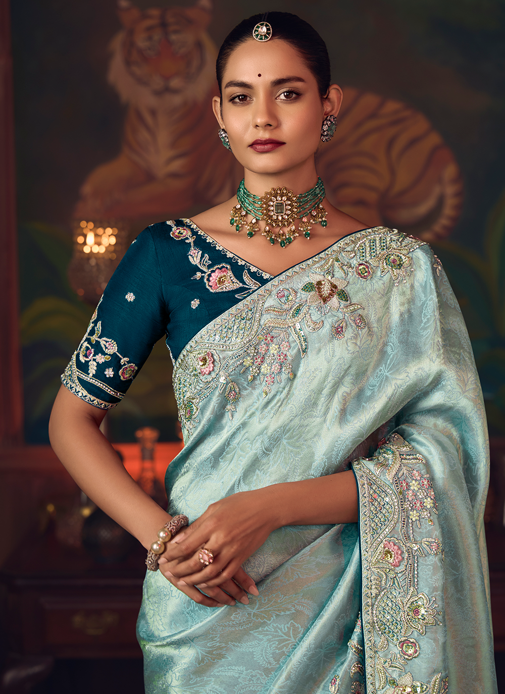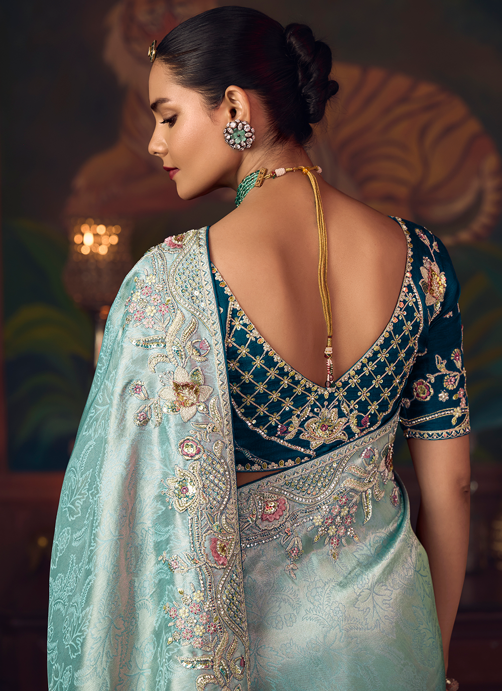 Elevate your wedding wardrobe with this exquisite Sky Blue Banarasi silk saree, where centuries-old weaving traditions meet contemporary sophistication. The luxurious fabric flows gracefully, complementing every body type with effortless poise. Intricate zari embroidery, shimmering sequins, and ornate beadwork adorn the rich border and pallu, creating an unmistakably regal presence. Each detail—from the delicate motifs scattered across the fabric to the resham and appliqué accents—speaks to masterful craftsmanship. The matching embroidered silk blouse features stunning embellishments on the sleeves, neckline, and back, completing a cohesive ensemble. Designed for brides and guests seeking that unforgettable moment, this saree transforms any celebration into a showcase of timeless beauty and refined taste.