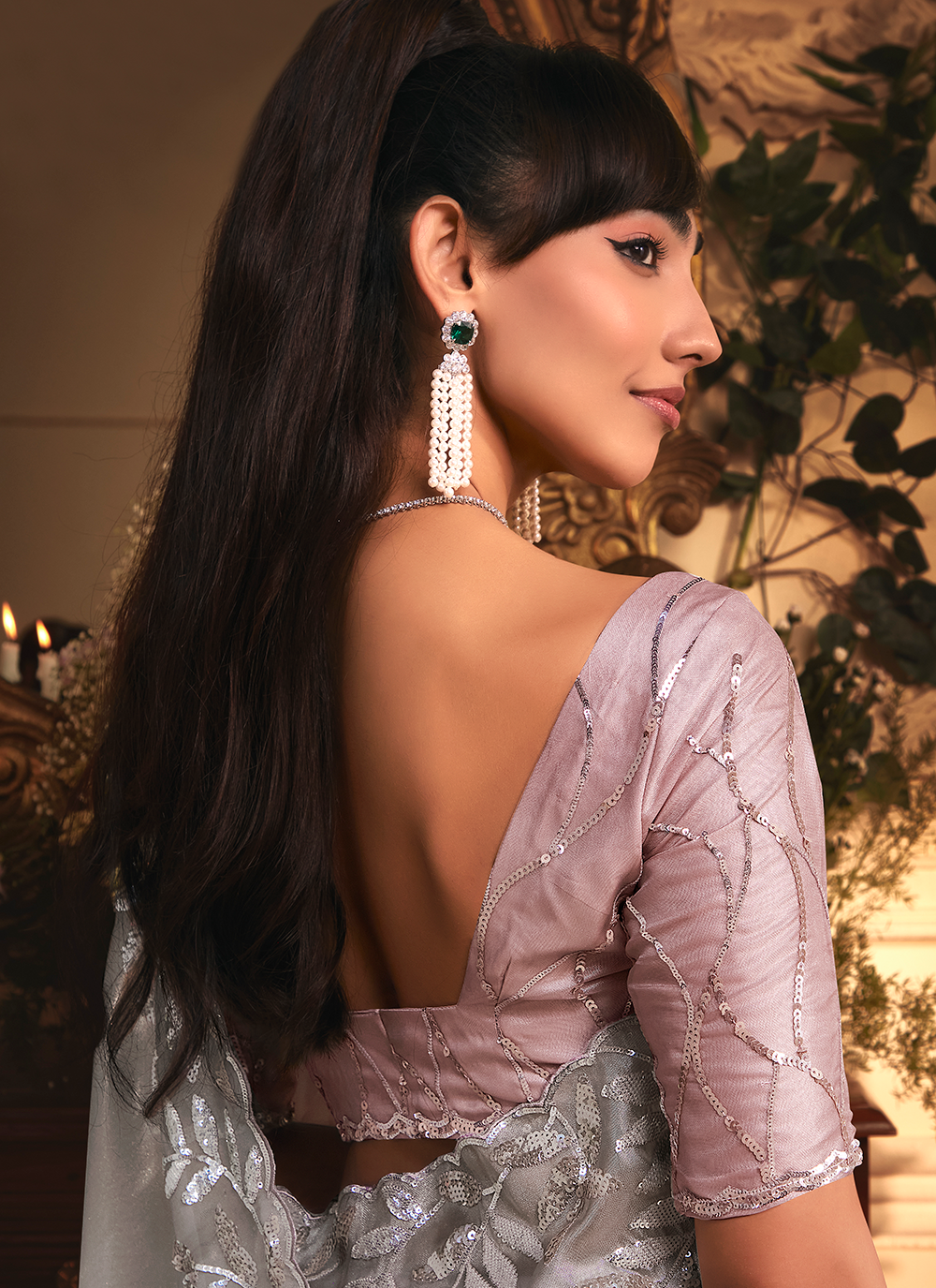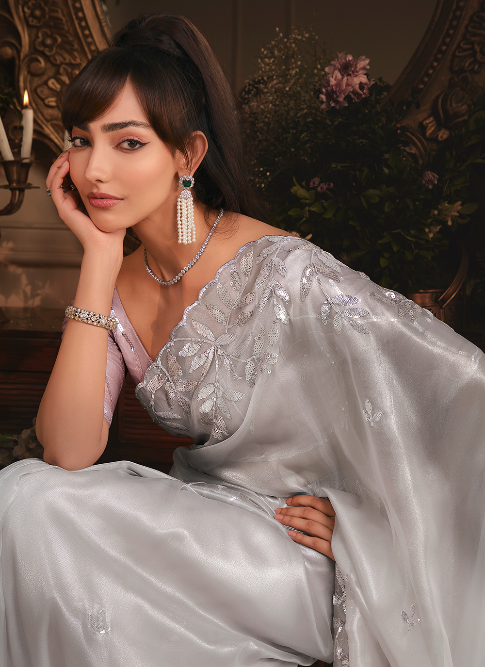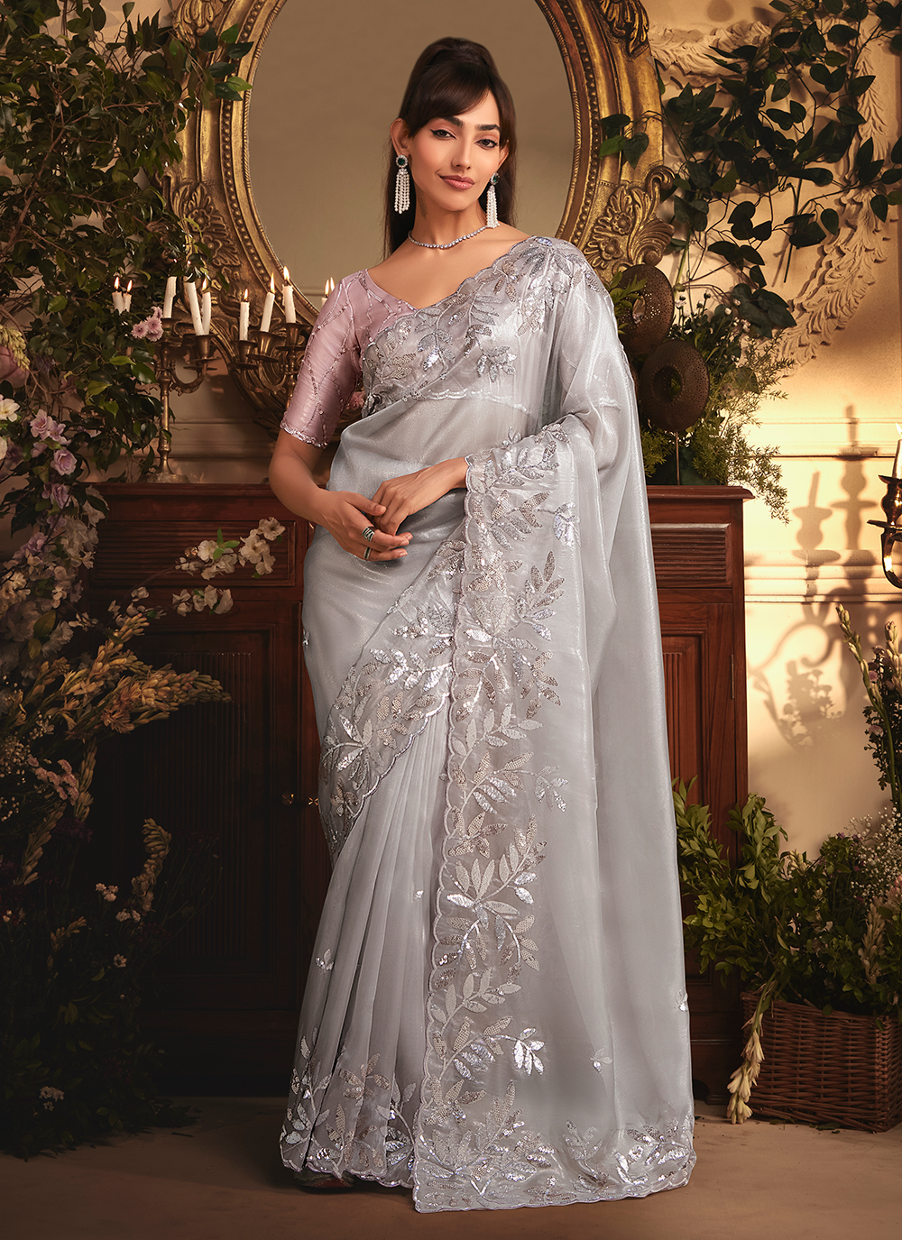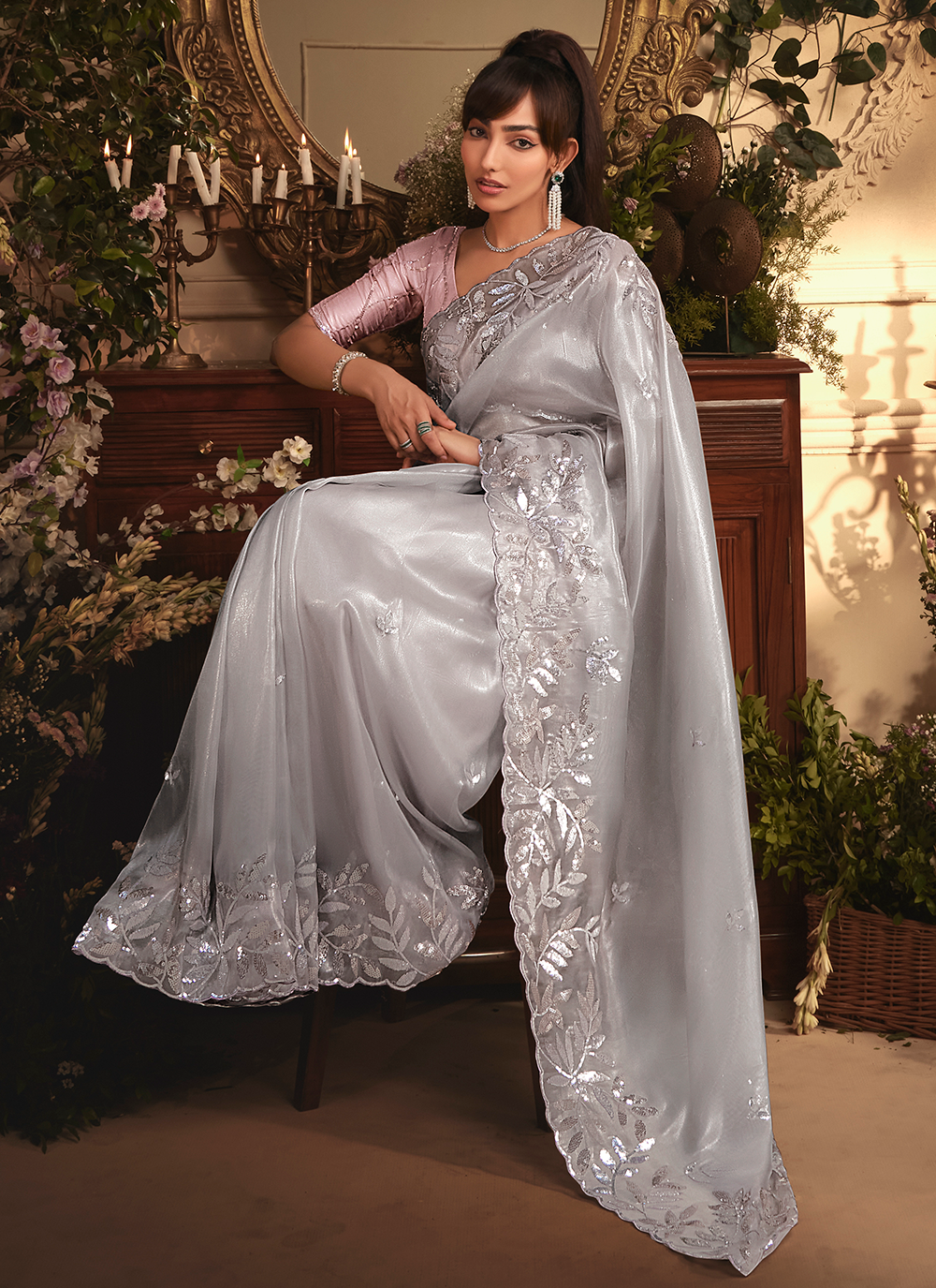 Make a sophisticated statement in this exquisite Dove Gray Organza Tissue Silk Saree, where refined tradition meets contemporary style. Woven from premium organza tissue silk, this reception-ready piece showcases delicate embroidery and refined sequin accents that enhance your natural elegance. The luminous border, buttis, and pallu are lavishly adorned with zari and resham threads, delivering an undeniably luxurious aesthetic. Complemented by a matching sequined satin silk blouse, this graceful saree combines timeless poise with modern charm. Perfect for receptions and special celebrations, it ensures you radiate confidence and sophistication throughout the evening.