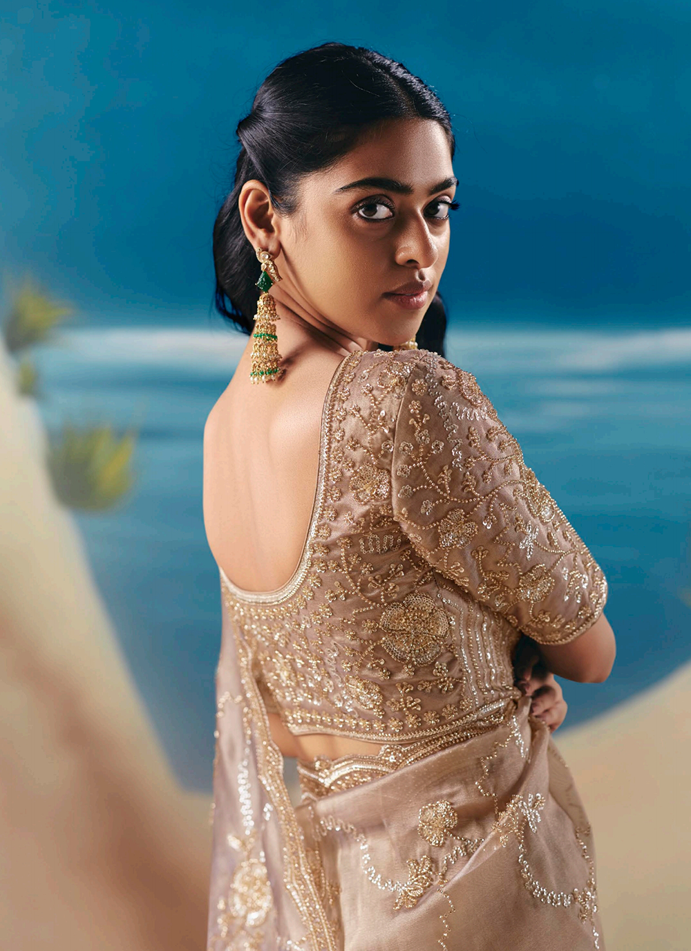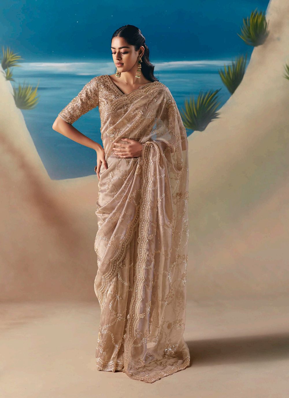 Captivate every room in this exquisite Champagne Pink Fancy Organza Tissue Silk Saree, designed for the sophisticated woman who honors tradition without sacrificing contemporary elegance. Woven from premium fabric that cascades beautifully, this sangeet-ready masterpiece showcases intricate hand-embroidered traditional motifs across the border, hem, and pallu—lavishly adorned with resham thread, golden zari, luminous pearl beads, sequins, and cutdana moti for an unmistakably opulent finish. The accompanying fancy silk blouse boasts extensive embellishment on the sleeves, neckline, and back, seamlessly blending heritage craftsmanship with modern sensibility. Perfect for weddings, festive celebrations, and evening occasions, this saree guarantees you'll command attention with grace and poise. Complete your stunning look with refined jewelry and elegant heels.