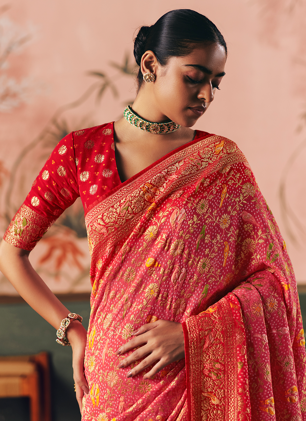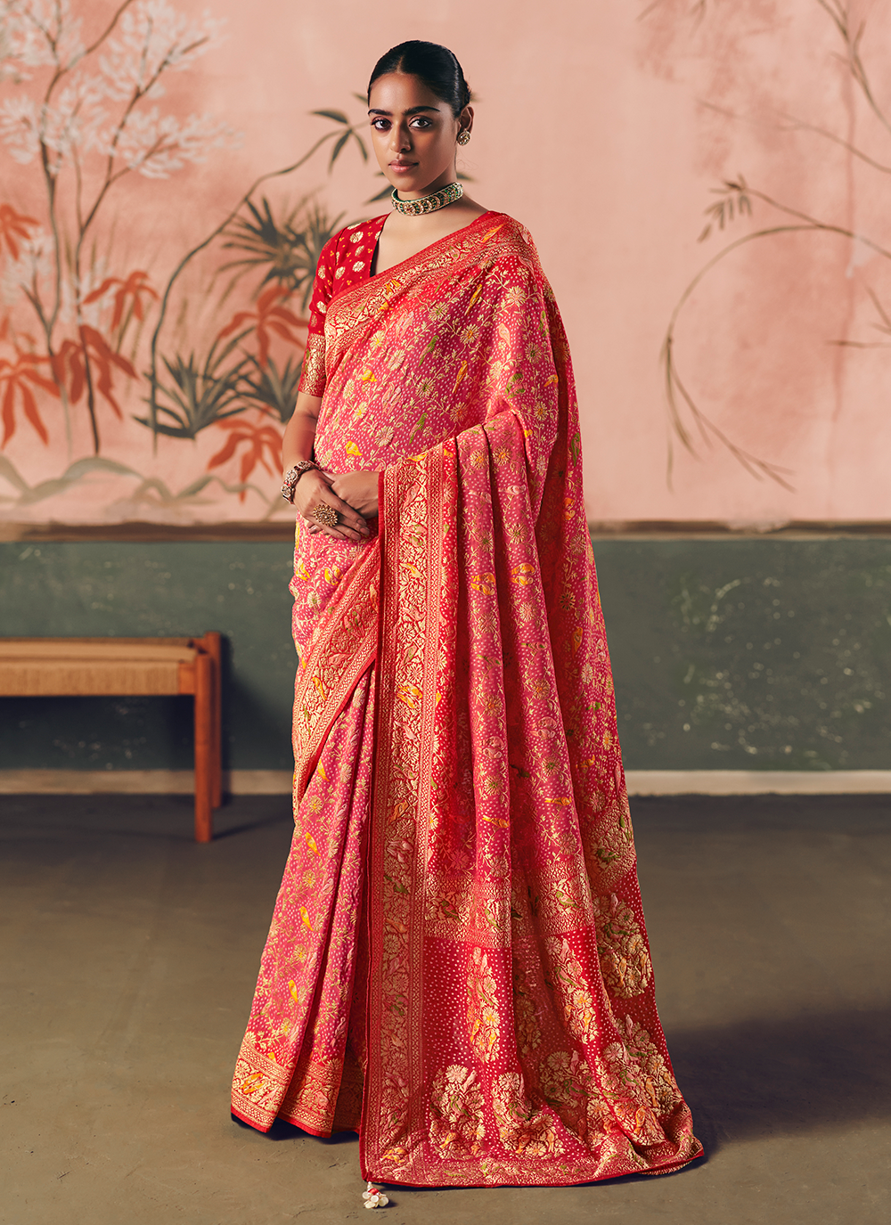 Discover the perfect fusion of tradition and grace with this exquisite Pink Red Khaddi Georgette Saree. Handcrafted from luxurious pure khaddi georgette, it showcases masterful bandhej artistry paired with refined digital prints and shimmering zari accents that elegantly frame the border and pallu. Every vibrant motif speaks to authentic Indian heritage, while the coordinating pure khaddi georgette blouse ensures a seamlessly polished presentation. Ideal for weddings, receptions, and festive celebrations, this saree effortlessly elevates your presence with understated sophistication. Complete your look with gleaming gold jewelry and elegant heels to radiate timeless beauty and cultural pride at every occasion.