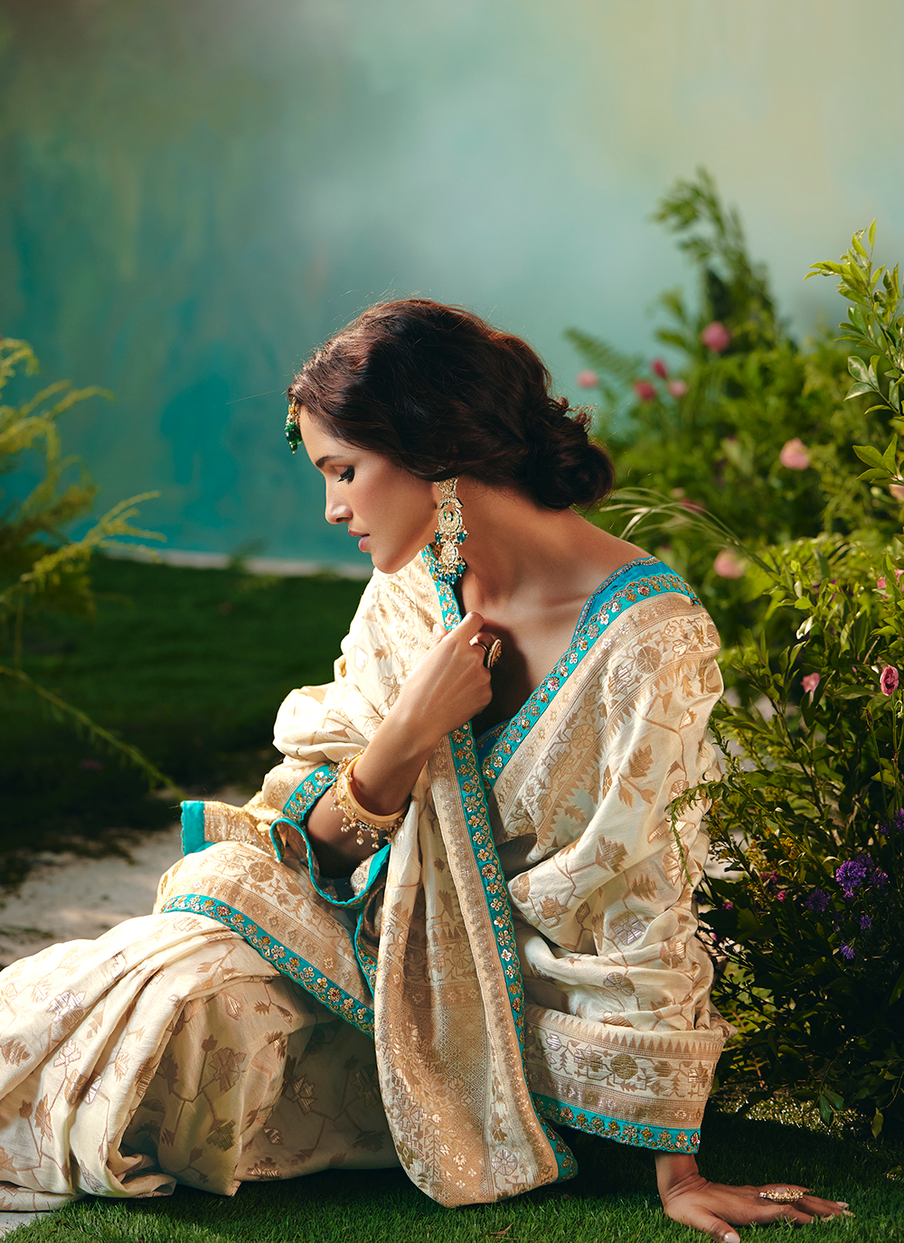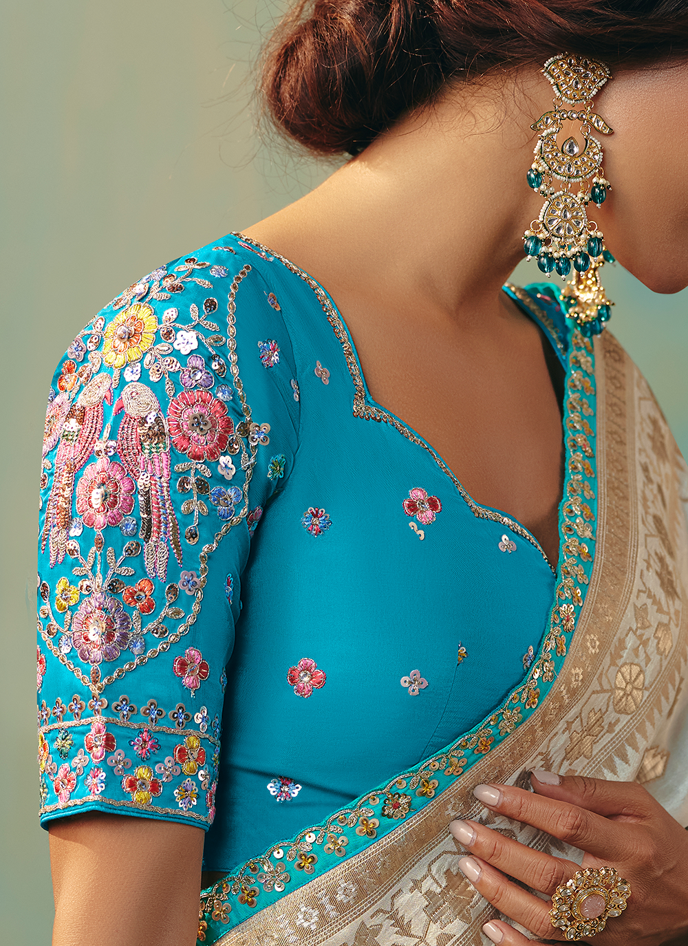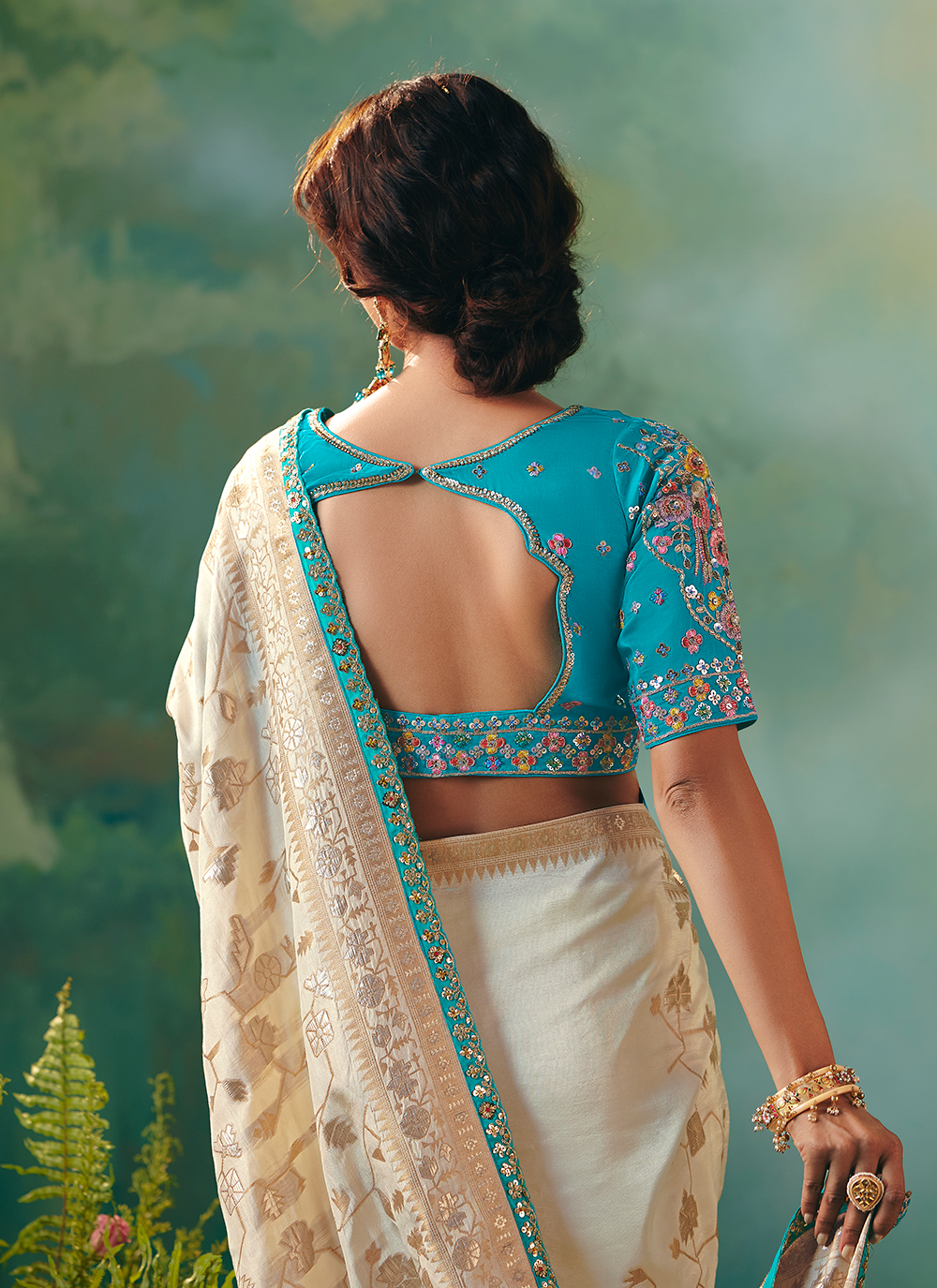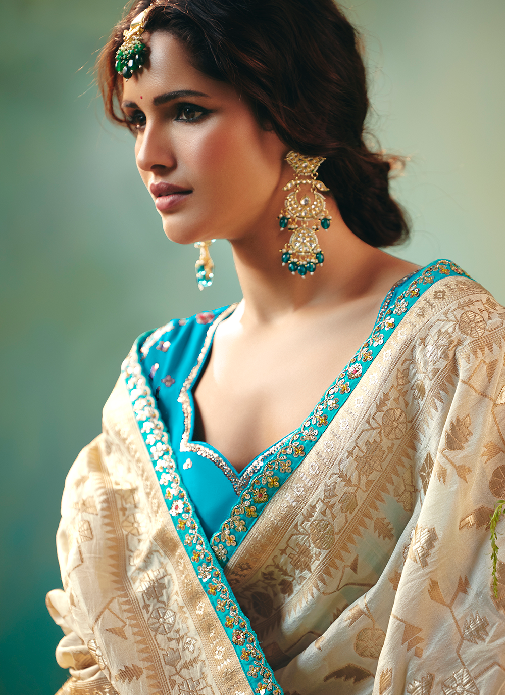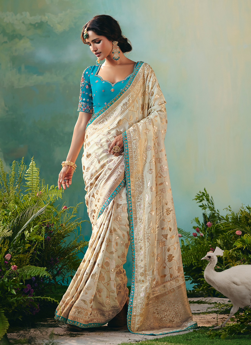 Step into the spotlight with this exquisite Cream Dola Viscose Silk Saree, a Bollywood-inspired masterpiece designed for reception wear and grand celebrations. The luxurious cream fabric is adorned with lustrous gold zari weaving and delicate floral embroidery, creating an air of refined sophistication. Paired with a striking Turquoise Blue embroidered blouse, this ensemble delivers a stunning color contrast that exudes regal elegance. The sumptuous silk drapes gracefully to enhance your natural beauty, while the ornate blouse elevates your entire look. Perfect for weddings, festive occasions, and traditional events, this versatile saree ensures you make an unforgettable statement with timeless charm and contemporary flair.