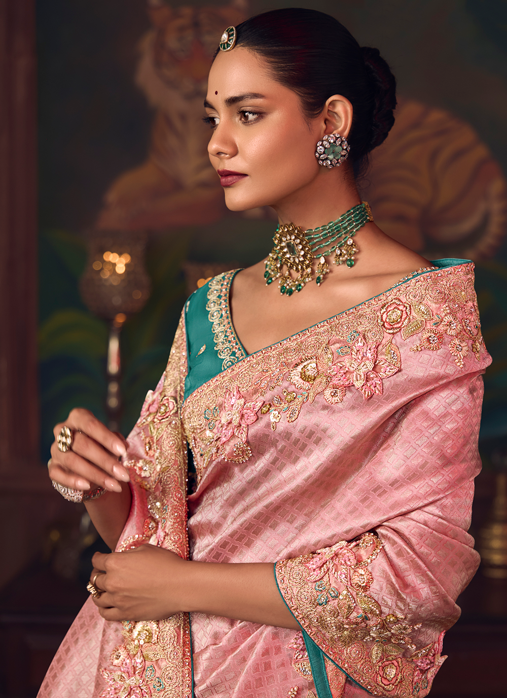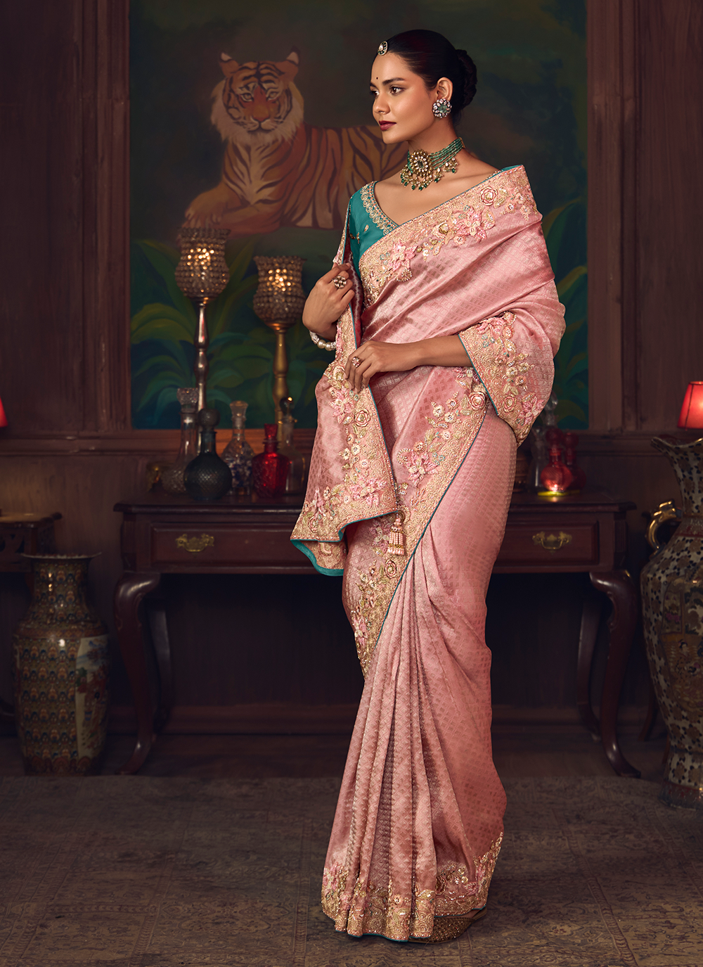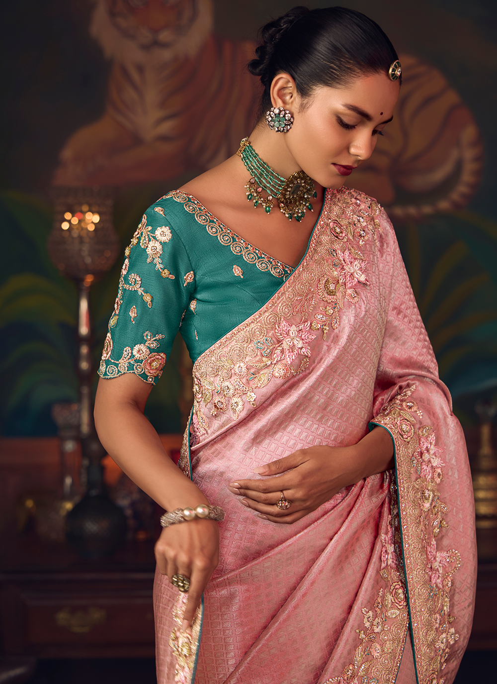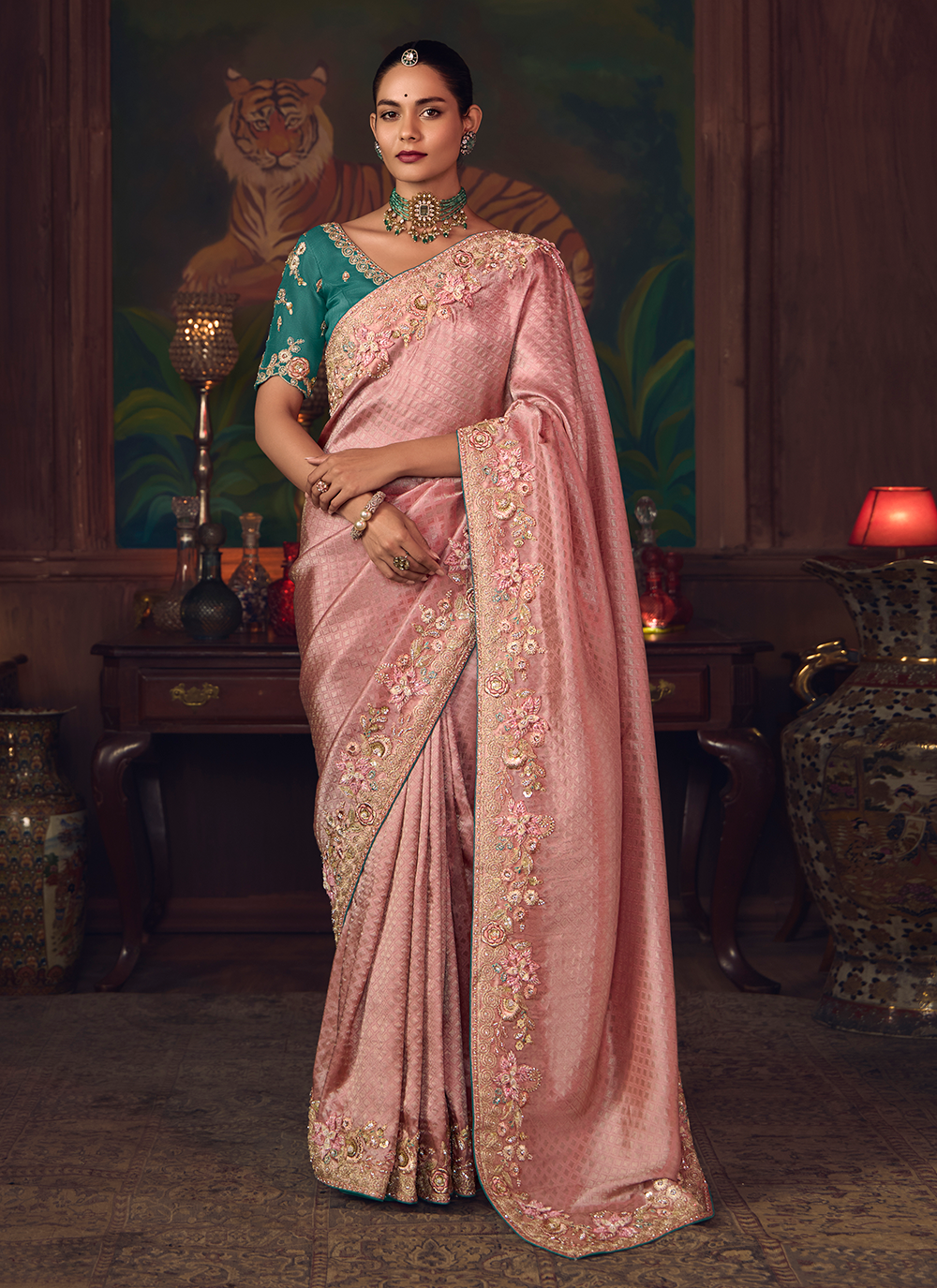 Experience the enchantment of this exquisite Light Pink Banarasi silk saree, a masterpiece of traditional craftsmanship and contemporary allure. Woven from premium silk, it features stunning sequin embroidery, intricate stone work, and elaborate zari detailing that adorns the border and pallu with breathtaking elegance. The luxurious fabric drapes with sublime grace, offering both comfort and a flattering silhouette. The striking teal designer blouse provides a bold contrast that elevates the entire ensemble, creating a harmonious balance of color and sophistication. Perfect for weddings, receptions, and special celebrations, this saree captures the essence of refined beauty and ensures you make an unforgettable impression with timeless ethnic charm.