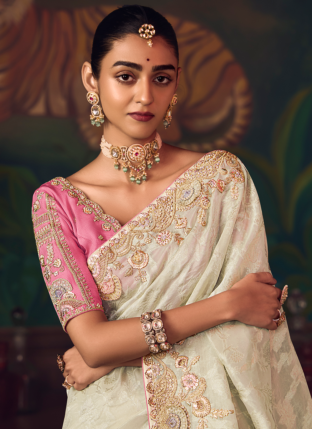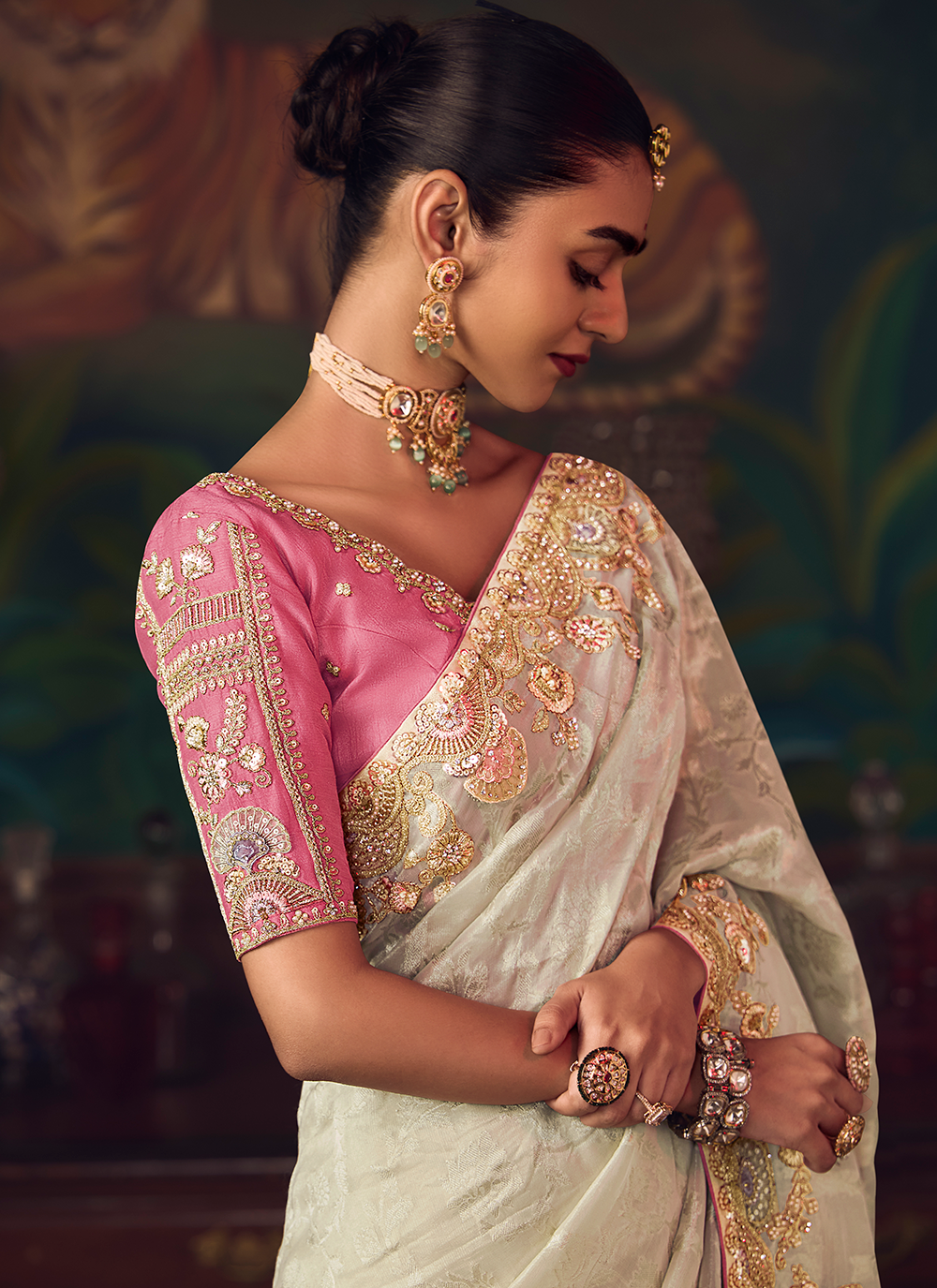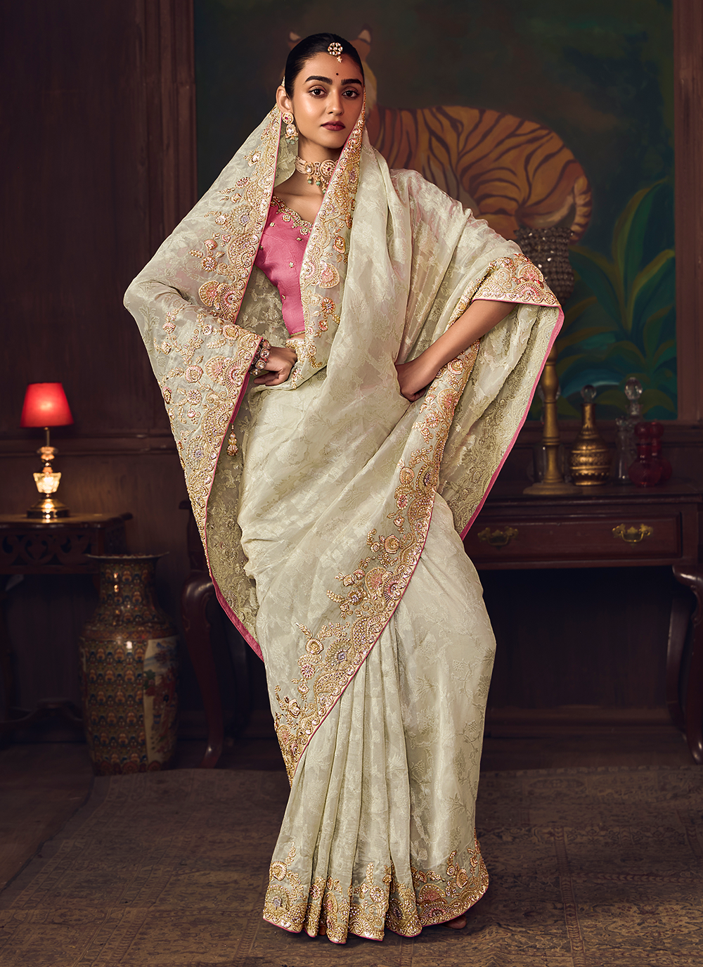 Indulge in the refined beauty of this Off-White Banarasi silk saree, a perfect blend of classic tradition and modern elegance. Meticulously crafted from premium silk, it features exquisite sequin embroidery and intricate zari detailing along the borders, creating a sophisticated aesthetic that commands attention. The serene off-white tone exudes timeless grace, while the striking pink designer blouse provides a contemporary contrast that elevates the entire ensemble. With its flawless drape and luxurious finish, this saree is your ideal choice for weddings, receptions, and festive celebrations. Experience the perfect harmony of heritage craftsmanship and contemporary style that ensures you shine with understated elegance.